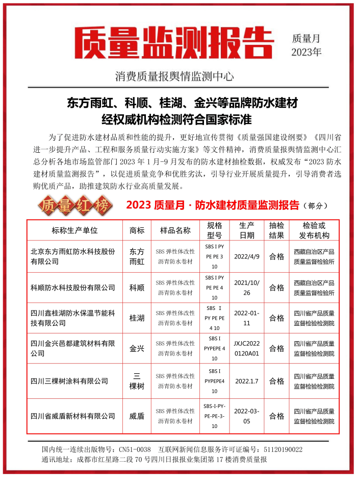 为了促进防水建材品质和性能的提升,更好地宣传贯彻《质量强国建设纲要》《四川省进一步提升产品、工程和服务质量行动实施方案》等文件精神,消费质量报舆情监测中心汇总分析全国各地市场监管部门2023年1月-9月抽检数据,权威发布“2023防水建材质量监测报告”,以促进质量竞争和优胜劣汰,引导行业开展质量提升,引导消费者选购优质产品,助推建筑防水行业高质量发展。