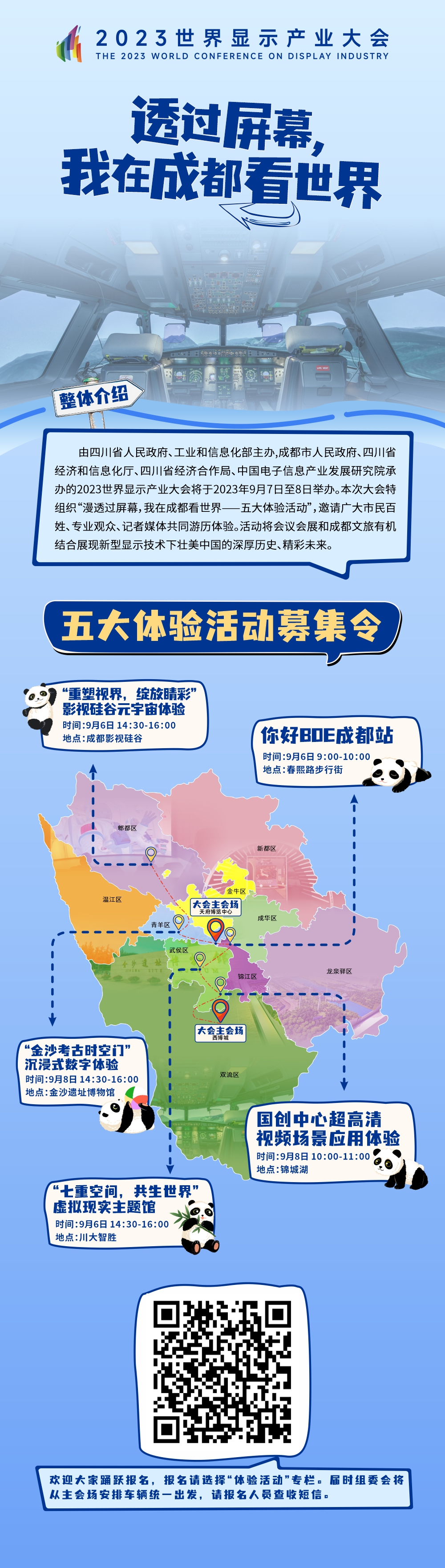 2023世界显示产业大会将于9月7日至8日在成都举办。组委会携手产业界重点企业、机构组织了五大体验活动,让广大观众透过屏幕,就能看到世界的精彩。不论你是践行“行万里路”的游客,还是高新技术爱好者,都能够在此次大会“显示”和“文旅”的双向奔赴中走出一段不一样的“City Walk”。一起来看看。