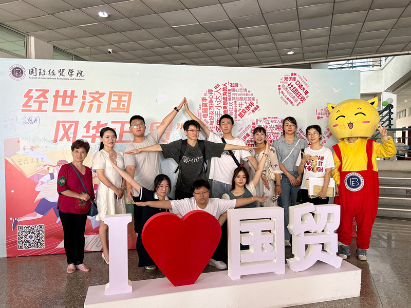早在开学报到前三天,国际经贸学院便向新生发送了一份“未来么”订单,300多位新生带着对大学的期待和憧憬写下了属于自己的关键词。学院根据词频将其绘制成“星球”词云图,展示在德经楼一楼大厅“经世济国,风华正‘贸’”打卡墙上。前来报到的新同学们纷纷被其吸引,驻足观看。在“学业”星球上,有的同学想成为“专业大咖”,有的想成为“绩点王者”,也有的想成为“科研大佬”;在“技能”星球上,“口语达人”和“电脑高手”则成为大多新生的追求和目标;在“生活”星球上,“扩大社交范围”“认识更多志同道合的朋友”成为大多数同学的选择……同学们还用“牛”“独立”“乐观”“温暖”“自律”“非凡”“为国”“闪闪发光”等正能量词语描绘想要成为的自己。贸经2301班梁星月同学说:“非常喜欢学院为我们准备的‘见面礼’,星球展板上的关键词让我感受到同学们面对大学生活都充满期待,我也跃跃欲试,想要快点开启我的大学之旅!”展板旁的游戏区又有别样一番景象。“同学快来!一起做任务!赢礼物!”学院精心设计了协同游戏,引导新生们共同按要求摆出打卡姿势,他们或相互支撑,做出“花开”的形状;或手拉手组成 “八芒星”的图案;或展开双臂,拥抱新征程……有趣的游戏环节瞬间就拉近了同学间的关系,欢声笑语弥漫着整个大厅,洋溢着热闹的氛围。