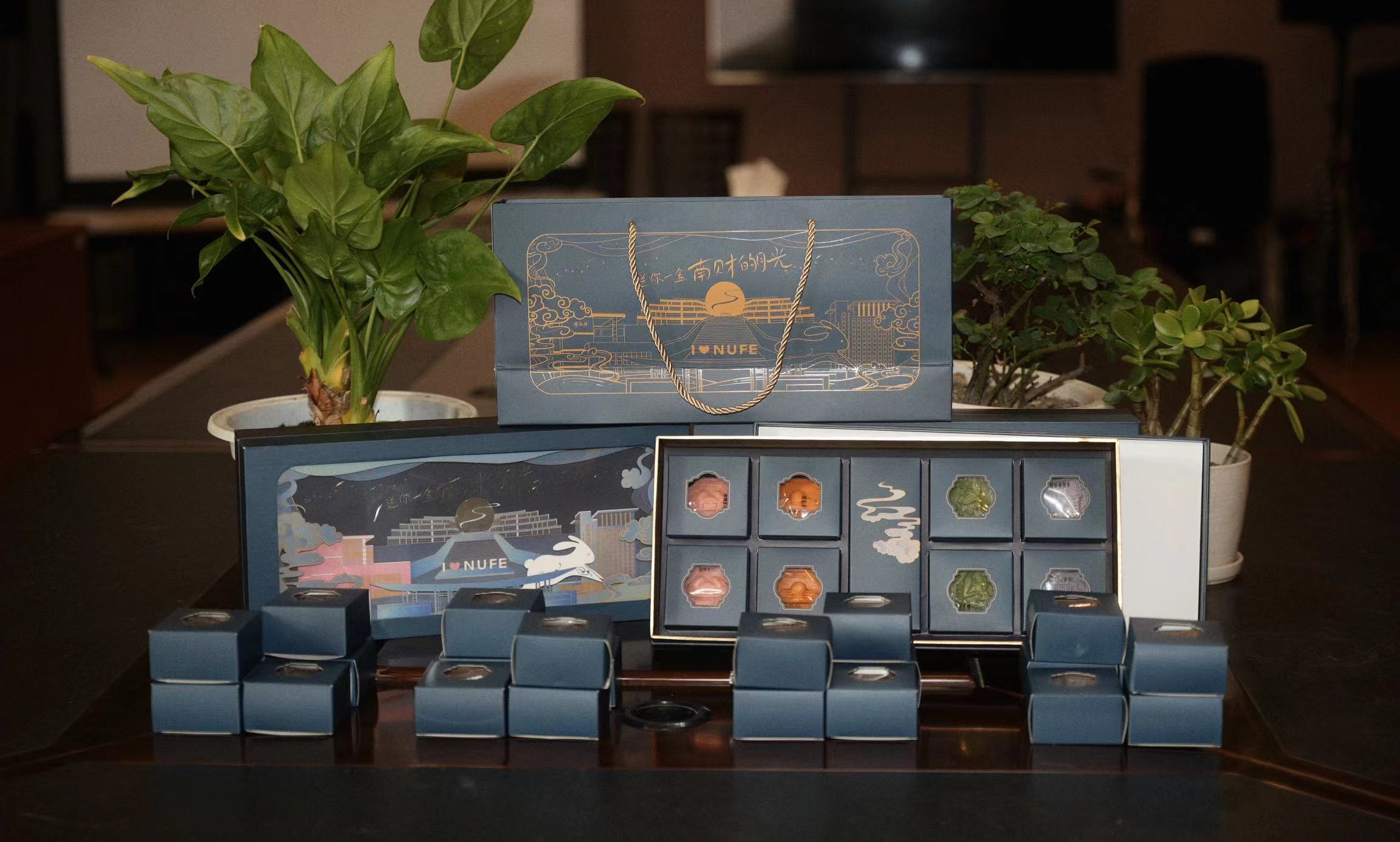 在艺术设计学院“新生 新升 新声”迎新现场,学院贴心地为报到的同学们准备了新生大礼包,充满艺术特色的文创周边吸引了新同学们和家长们的关注。其中,“送你一盒南财的月光”月饼吸引了萌新们的驻足,这是特意为绿色通道的受资助同学准备的月饼。早在暑假期间,由艺术设计学院陈帅杰、谢远菁同学们带领的月饼文创团队就已经在忙碌了。“送你一盒南财的月光”月饼将南财特色建筑与广式月饼相结合,采用八角外形,寓意吉祥、完整、幸福、长寿和健康;饼面的南财建筑采用了立体浮雕开模技术,更好地展现建筑的立体感,整体精致且饱满。创业团队自主联系食品加工厂,全程监控食材的选择和加工的细节,进行生产和包装。“马上就到中秋节了,趁着迎新,我们给同学们准备了精心定制的月饼。希望第一次离家的同学们在开学的第一天能在南财感受到家一样的温暖,也希望他们能因此开启他们‘圆满’的大学生活。”艺术设计学院党委副书记张荣霞说道。