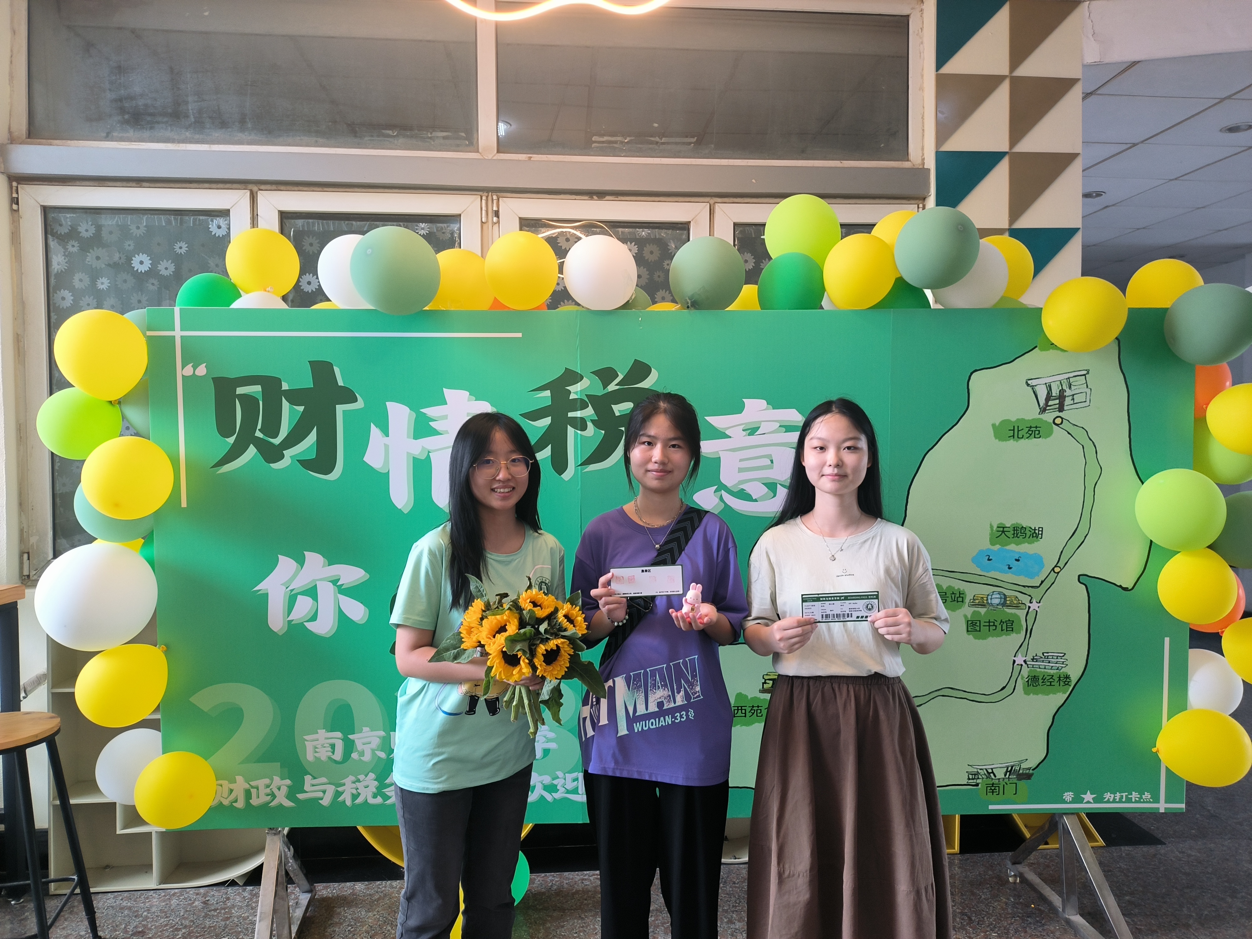 财政与税务学院以“NUFE Walk”为主题,以时下流行的“City Walk”元素融入打卡盖章为新生们设计了别具特色的迎新活动。新生们在报到时领取一张飞机票,可以在设计的“NUFE Walk”路线上,前往教学楼、餐厅、图书馆、宿管站4个新生们生活、学习的必经之地,让初来乍到的新生们快速了解、适应大学生活。这张飞机票不仅是“NUFE Walk”打卡集章的载体,反面更是大有乾坤——“绷紧防范之弦,远离诈骗之害”的标语跃然纸上,反诈宣传的“开学第一课”不期而遇。新生们拿上登机牌开始校园之旅,通过回答财税相关问题、反诈知识的方式获得“财”“情”“税”“意”四字印章。“转账不可轻信”“税收强制性”“起征点是需要的”……财税的“小萌新”们围站在打卡点前,热火朝天地讨论着每个问题。为了迎接23级的“小萌新”们,学长学姐们别出心裁地设计了“财小税”周边文创送给新生们。通过收集的打卡点印章,可兑换“财小税”兔兔组合的贴纸、兔兔包以及兔兔文件夹等原创周边,甚至还有“反诈兔兔警官”限定版兔兔盲盒,满满惊喜。穿过童话而缤纷的向日葵气球是“NUFE Walk”地图板,地图中藏着南财校园中的小惊喜,期待着新生们用善于发现的眼睛去寻找校园中的小确幸。打卡完成的新生回到大厅与老师们种下了录取通知书里的向日葵种子,也种下了对自己大学生活的美好期许,“NUFE Walk”是新生于南财四年美好生活的起点,亦是他们人生旅途中奋楫破浪的起点。