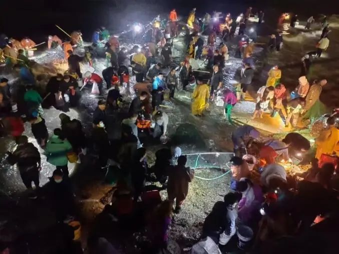 2022年10月5日晚,烟台开发区八角湾惊现大量硕大肥美的海肠,在海滩上,上千人扎堆捕捞海肠 图片来源:齐鲁晚报