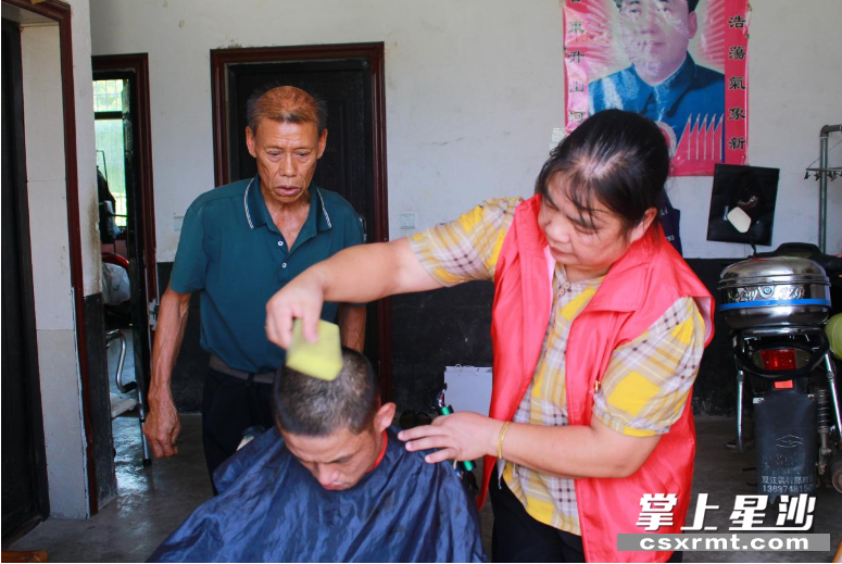 “金牌嫂子”志愿者饶海霞正在给村民理发,志愿服务行善举。袁语丹 摄