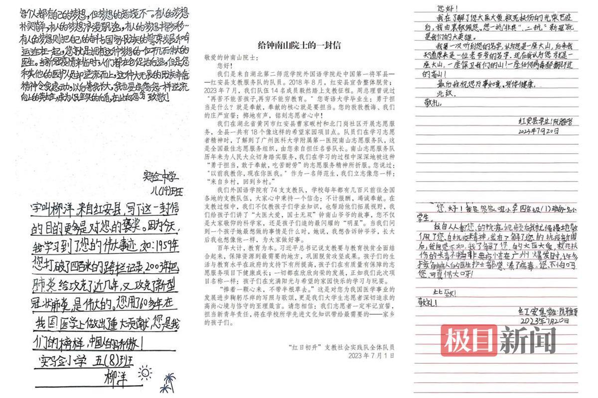 该校外国语学院团委负责人伍晓飞介绍,1个月以前,“红日初升”团队大学生志愿者在黄冈市红安县进行支教,为充分激发青少年儿童的爱国情怀,志愿服务队结合实际将爱国主义主题教育融入教学过程中,充分发挥课堂教学对青少年儿童的育人功能,采取“讲”“读”“说”“动”相结合的方式对青少年儿童进行爱国主义启蒙教育。课上,志愿者向当地小朋友们讲述了钟南山爷爷的故事,小朋友们备受鼓舞并给钟南山爷爷写信,表达自己内心的崇拜敬佩之情。钟南山院士在收到小朋友的来信后亲自回信。