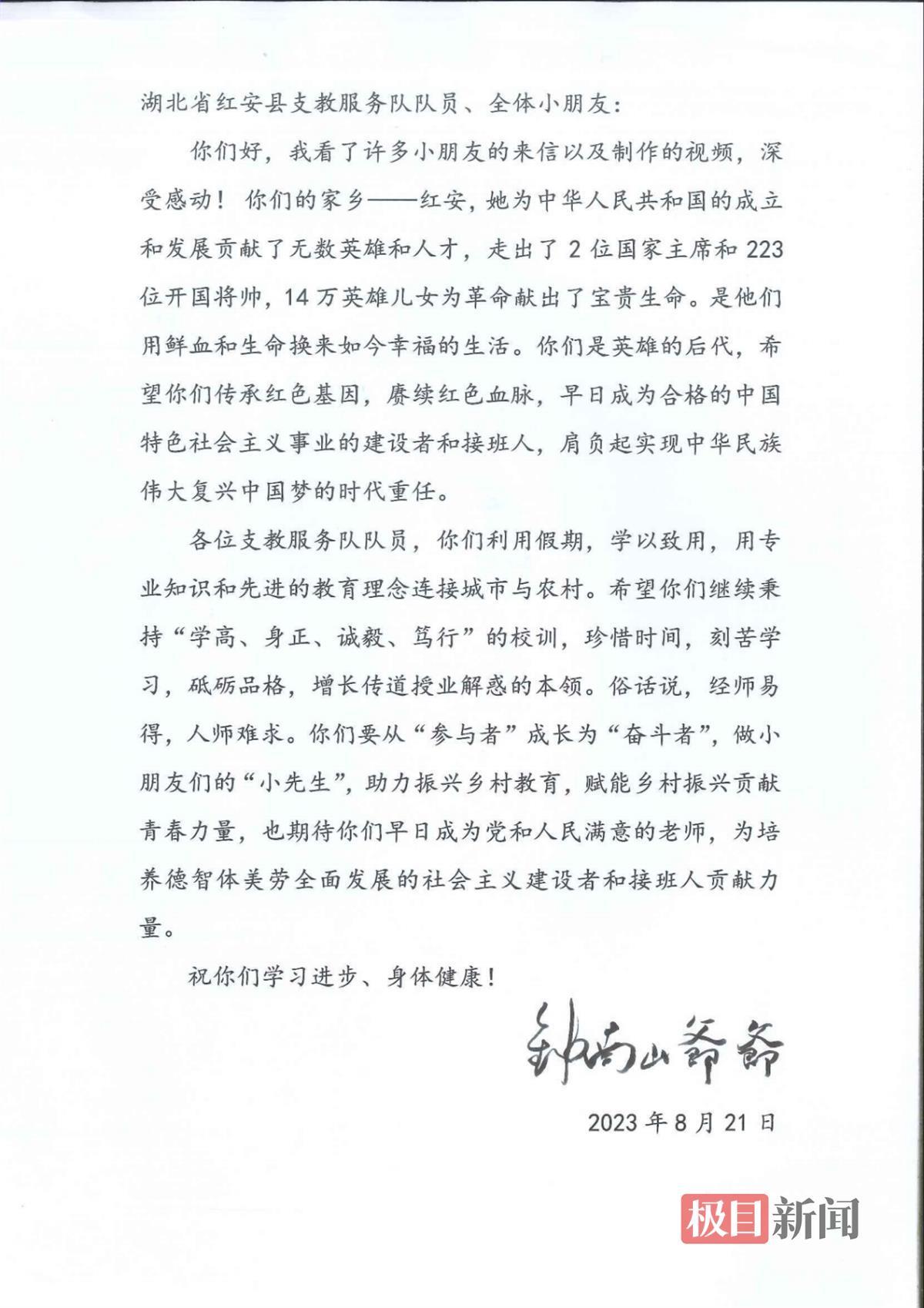 “湖北省红安县支教服务队队员、全体小朋友:你们好,我看了许多小朋友的来信以及制作的视频,深受感动!”近日,湖北第二师范学院外国语学院“红日初升”志愿服务队收到钟南山院士的一封回信。