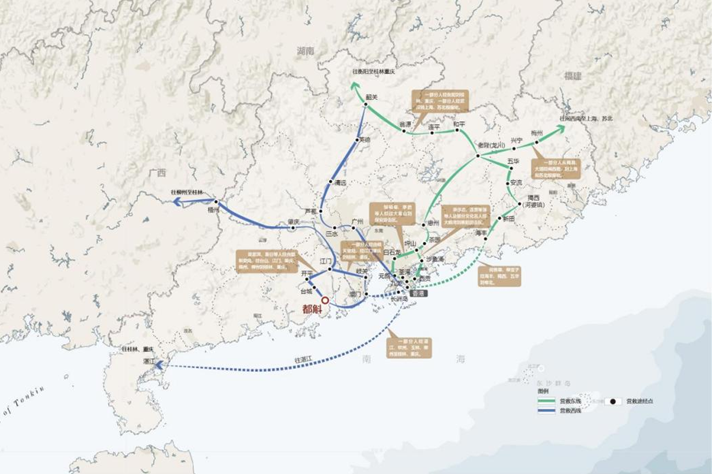 中国文化名人大营救的壮举也发生在这一时期,这场大营救跨越粤港澳三地。自1942年1月开 始,在周恩来、廖承志同志的直接指挥与中共香港地下组织的配合下,东江纵队与香港文化界人士取得联系,开始组织分批营救转移。广东“三师”专业志愿者阿瑞研究指出:转移线路主要有水、陆两条,还有一条粤西海上交通线。南粤古驿道是此次营救转运的主干线。被营救的文化名人及民主人士乘坐挂一帆的小艇,先由香港“偷渡”至澳门,再由澳门路环转往江门台山都斛登陆。这次行动历时半年多,共营救出800余人,无一人被敌人截获,无一人死伤。此举赢得国内外各界人士的赞誉,被认为是“抗战以来最伟大的‘抢救’工作”。