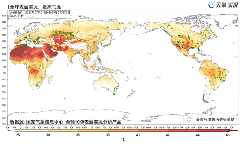 2023年7月全球最高气温分布(单位:℃)及突破历史同期极值站点分布(绿色圈) 图片来源:国家气象信息中心