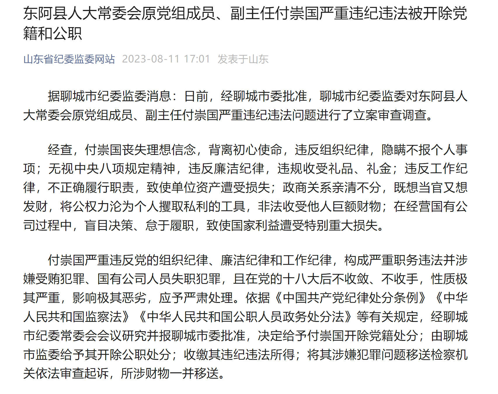 8月11日,据聊城市纪委监委消息:日前,经聊城市委批准,聊城市纪委监委对东阿县人大常委会原党组成员、副主任付崇国严重违纪违法问题进行了立案审查调查。