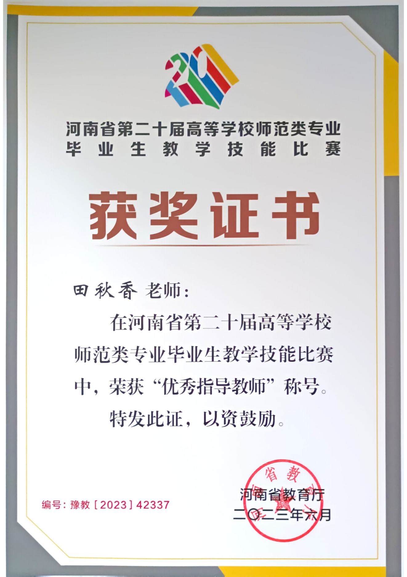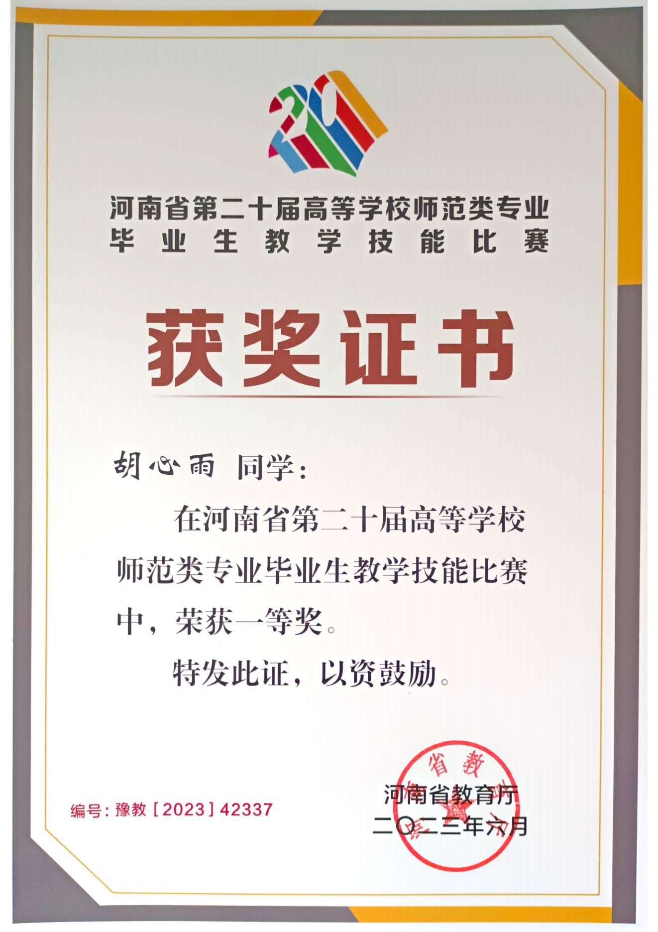 近日,河南省教育厅发布《关于公布第二十届高等学校师范类专业毕业生教学技能比赛结果的通知》,河南财政金融学院荣获团体组织奖三等奖,胡心雨等十三名同学取得优异成绩。其中,胡心雨同学获得一等奖,韩舒雨等四名同学获得二等奖、王楠等八名同学获得三等奖;田秋香老师获得优秀指导教师称号。