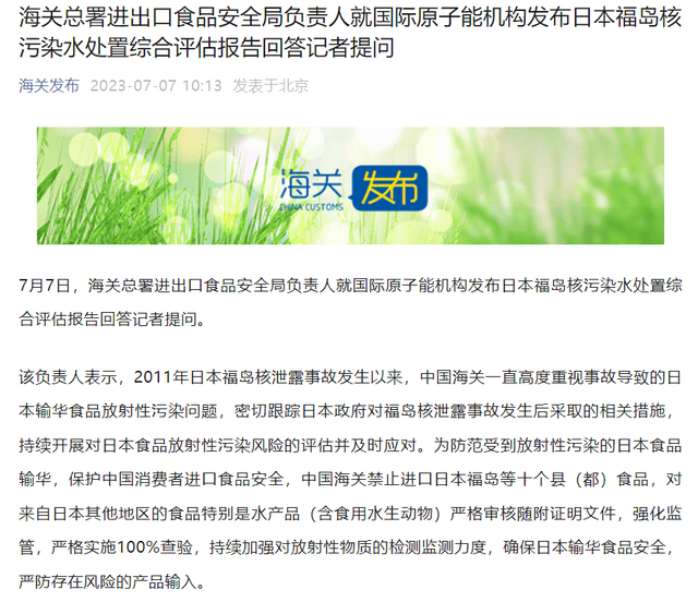 据海关发布:7月7日,海关总署进出口食品安全局负责人就国际原子能机构发布日本福岛核污染水处置综合评估报告回答记者提问。