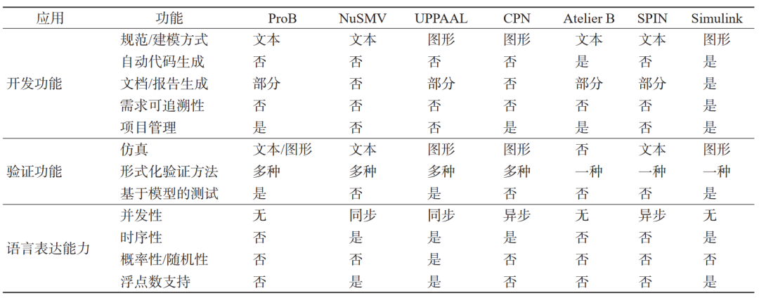 关于形式化工具的应用,从开发功能、验证功能和语言表达能力3方面进行了总结,如表2所示。由表2分析发现,主流形式化工具缺乏对开发功能的支持,尤其存在于自动代码生成和需求可追溯性这两方面,Simulink工具在支持当前列控领域开发方面性能优良。