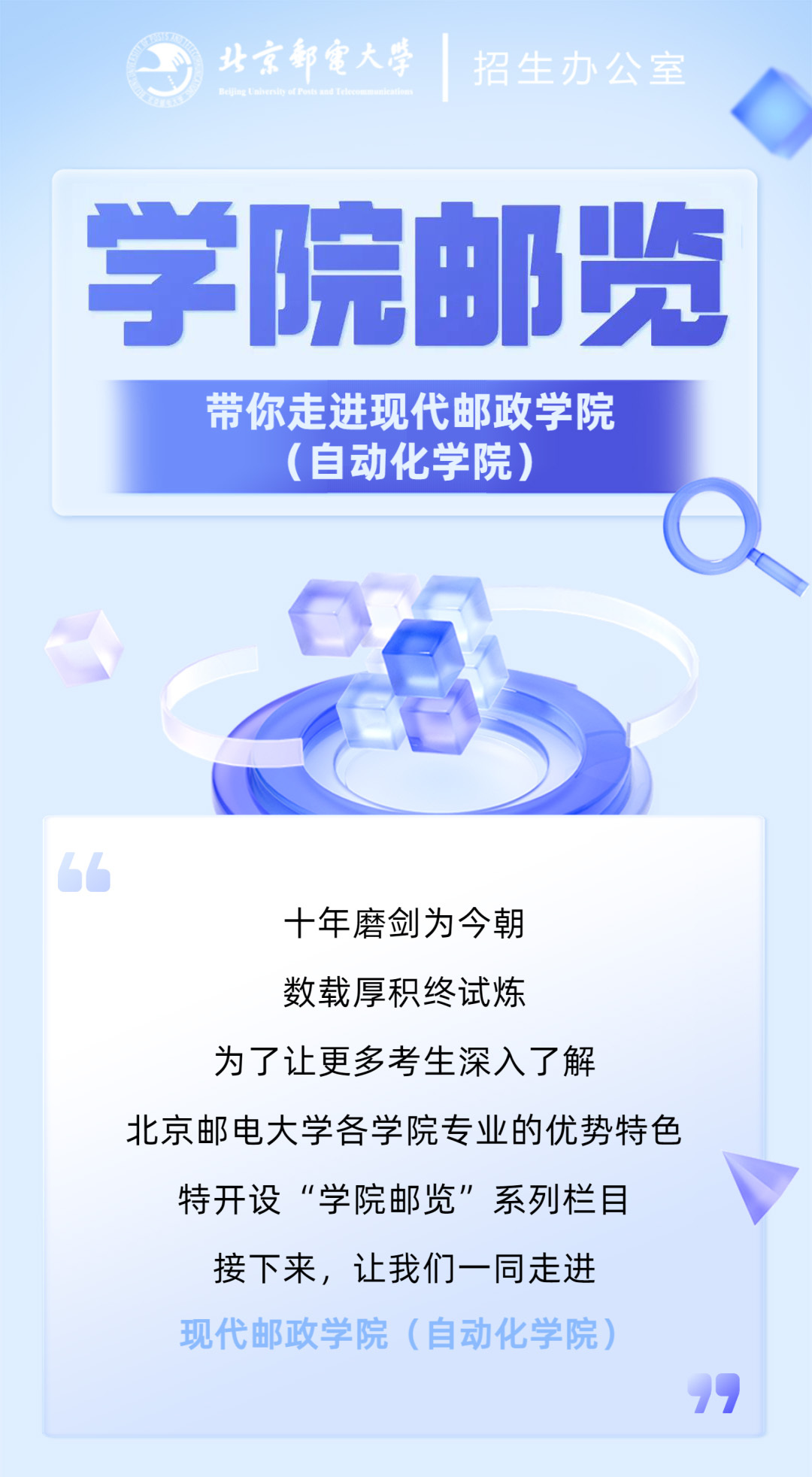 在当今万物互联的时代,随着现代流通体系国家战略的实施,基于人工智能、5G通信、区块链、物联网等技术的快速发展,智能装备制造、电子商务等行业正在迸发勃勃生机与活力,不断提升现代邮政与智慧物流全链条数字化水平,成为中国经济发展中的一匹黑马。现代邮政业的迅猛发展和向自动化、无人化、智能化方向的快速转型,对高层次技术人才和管理人才提出了迫切需求。北京邮电大学现代邮政学院(自动化学院)是全国高校中开设的首家现代邮政学院,承载着国家和行业的期待与重托,服务于畅通国内国际双循环,致力于培养智能机器人技术、智能装备、智慧运营、智慧物流、智慧决策等领域具有国际化视野的高端复合人才。欢迎有理想、有抱负的莘莘学子加入我院,用智慧、科学与创新来实现自己的人生理想,为把我国建设成为社会主义现代化强国、构建新发展格局而不懈努力!