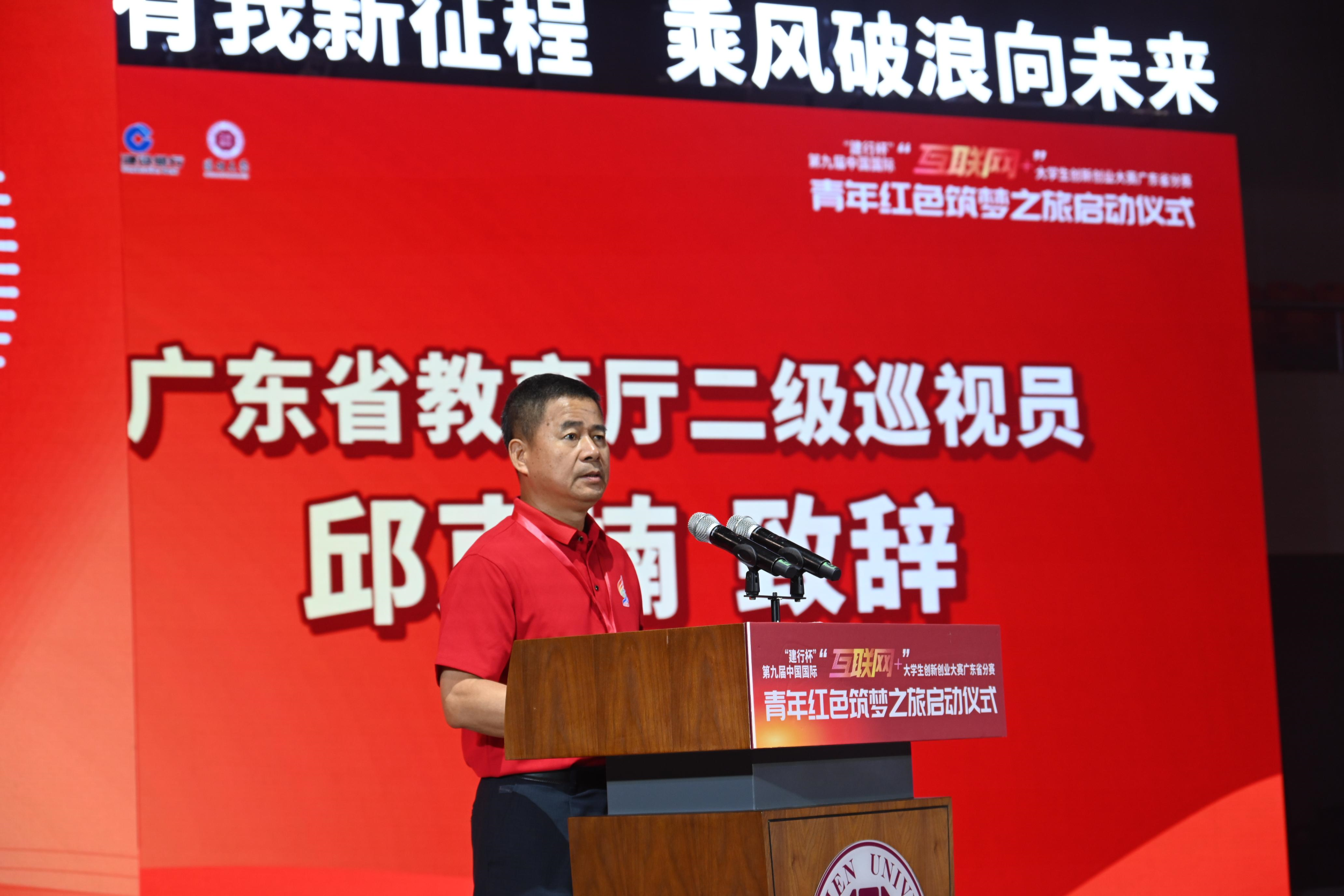 “要在充满机遇和挑战、变革和创新的新时代,始终保持激情和创造力,牢记初心使命,不畏艰难困苦,上山下乡出海,勇敢追逐梦想,以创新创业的勇气和智慧书写‘强国有我’的历史担当。”广东省教育厅二级巡视员邱克楠在仪式中致辞。他表示,“红旅”活动是本届“互联网+”大学生创新创业大赛的一项重要活动,是锚定教育强国目标,共同推动主题教育走深走实,引导广大师生在以学铸魂、以学增智、以学正风、以学促干方面取得实实在在成效的重要活动。他希望,以“青年”为主体,培养造就一支“双创”生力军,以“筑梦”为主旨,厚植青年学生家国情怀。