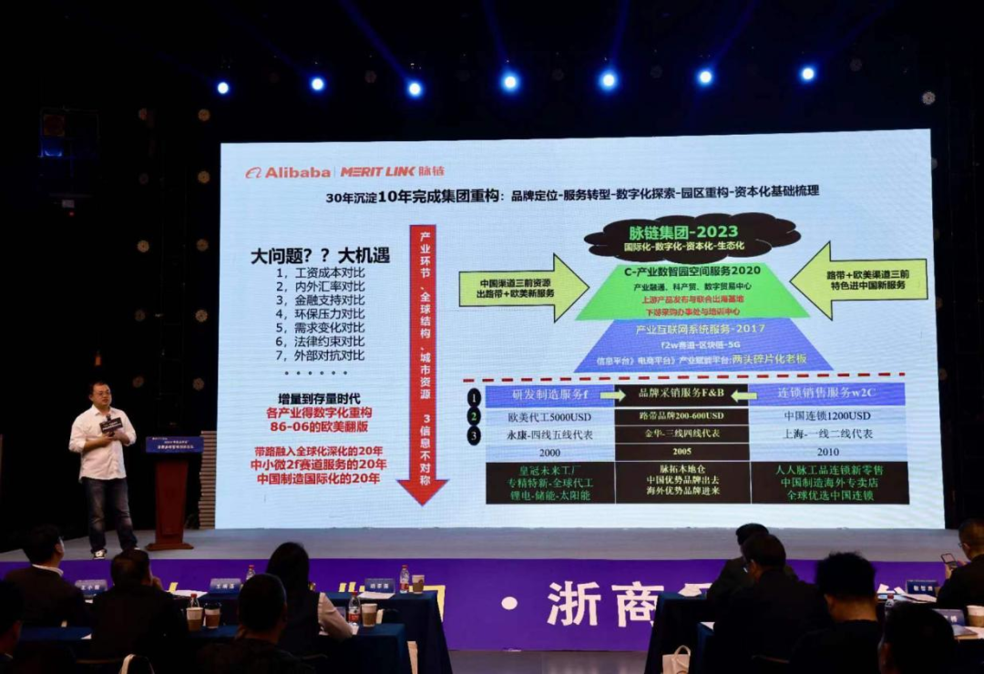 脉链集团徐伟强董事长作题为“产业带的品牌化数字化重构与双循环”的分享。他以永康五金产业带为例,提出“散小弱”的产业带在品牌化数字化重构后,将获得国内国外打通,终端用户打通,研发制造升级,服务资源共享的4大增量红利,他认为整个体系的重构是产业数字化、数字产业化的根本,企业应从甲方思维转变成乙方思维。