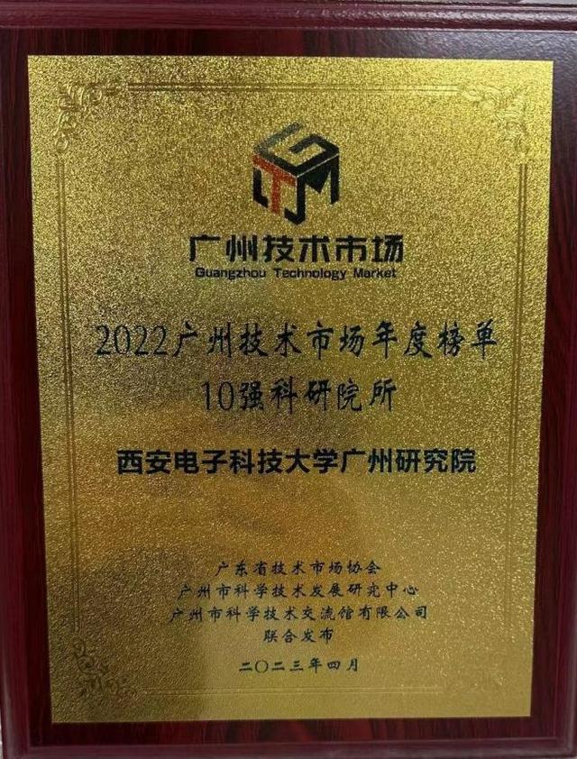 会议发布了由广东省技术市场协会、广州市科学技术发展研究中心、广州市科学技术交流馆有限公司联合制作的“2022广州技术市场年度榜单”。榜单通过定量与定性相结合的评价方法,对广州技术合同认定登记数据进行分析,分别设置“2022广州技术市场50强企业”“2022广州技术市场10强高校”“2022广州技术市场10强科研院所”三份主榜单。经过全体教职工2022年度的共同努力,西电广研院荣幸入选“2022广州技术市场10强科研院所”榜单。