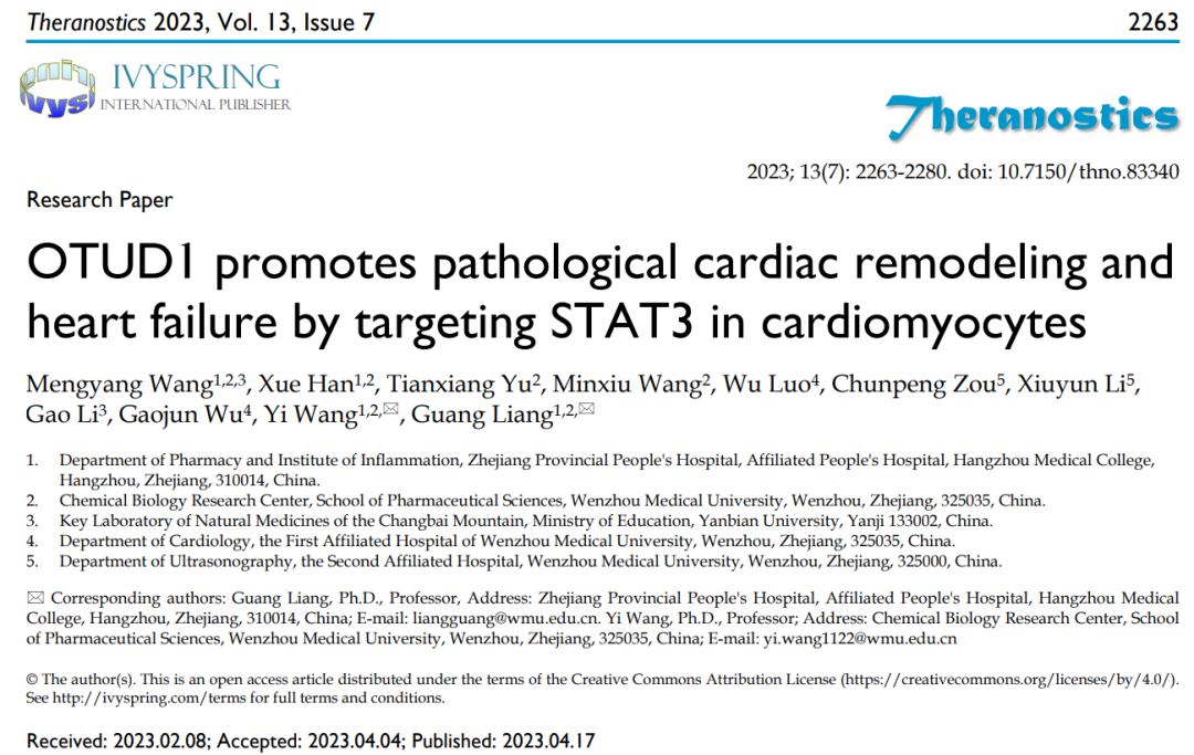 2023年4月15日,杭州医学院梁广教授课题组在国际权威期刊《Theranostics》(中科院Top一区,IF=11.6)以Original Article的形式在线发表题为“OTUD1 promotes pathological cardiac remodeling and heart failure by targeting STAT3 in cardiomyocytes”的研究论文,首次揭示并阐明了心肌细胞OTUD1在高血压心衰中的作用、机制和靶点。梁广研究员为通讯作者,延边大学2020级博士研究生王梦阳为第一作者。论文的第一单位和通讯单位为杭州医学院。