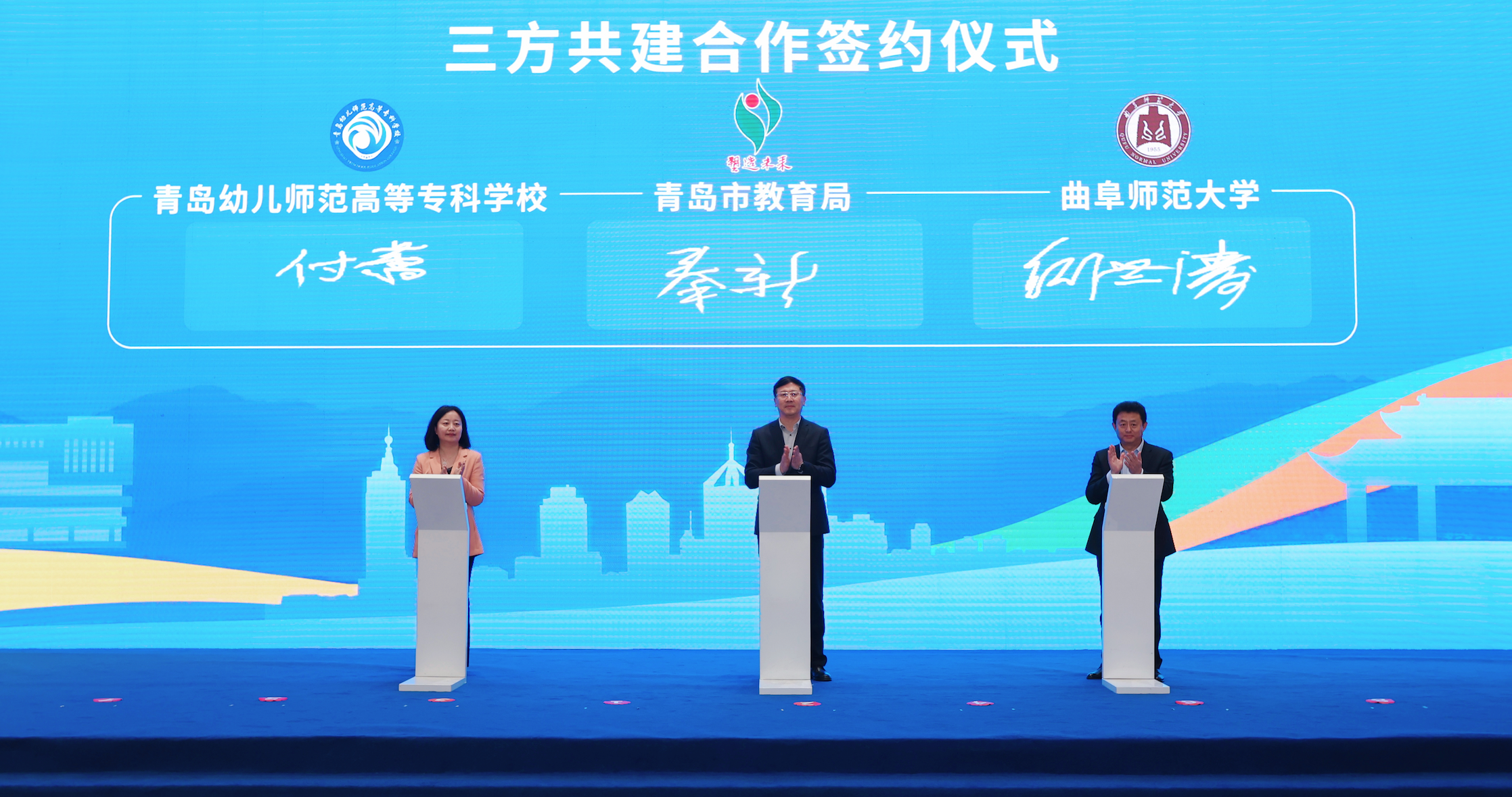 4月28日,青岛市教育局、曲阜师范大学、青岛幼儿师范高等专科学校三方共建战略合作协议签约仪式在青岛上合之珠国际博览中心黄河厅举行。
