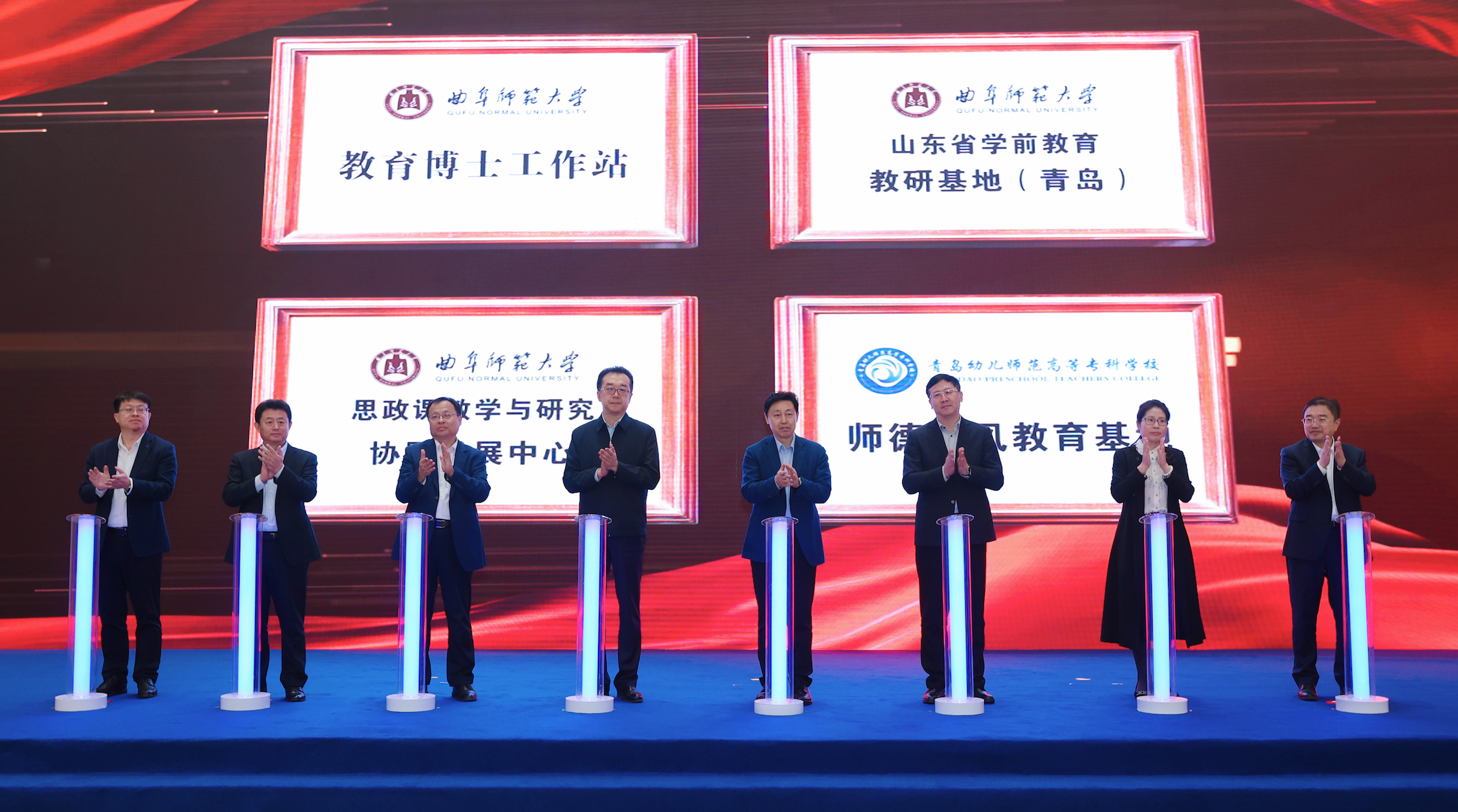 曲阜师范大学教育博士工作站、山东省学前教育研修基地(青岛),曲阜师范大学、青岛幼儿师范高等专科学校思政课教学与研究协同发展中心,青岛幼儿师范高等专科学校师德师风教育基地同时揭牌。