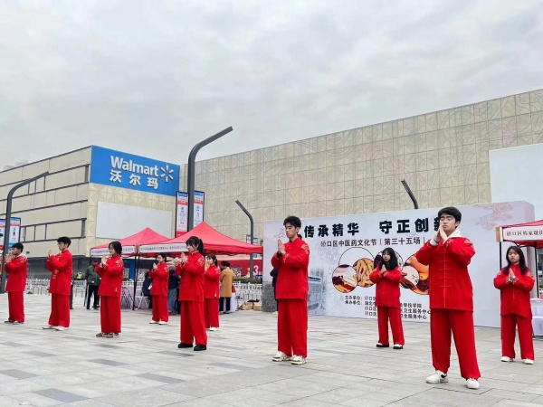 硚口区中医药文化节现场,中医学子为居民展示健身操。