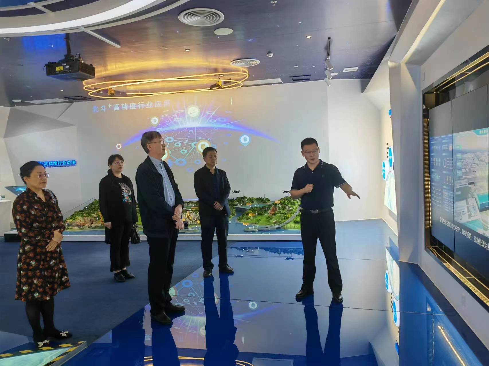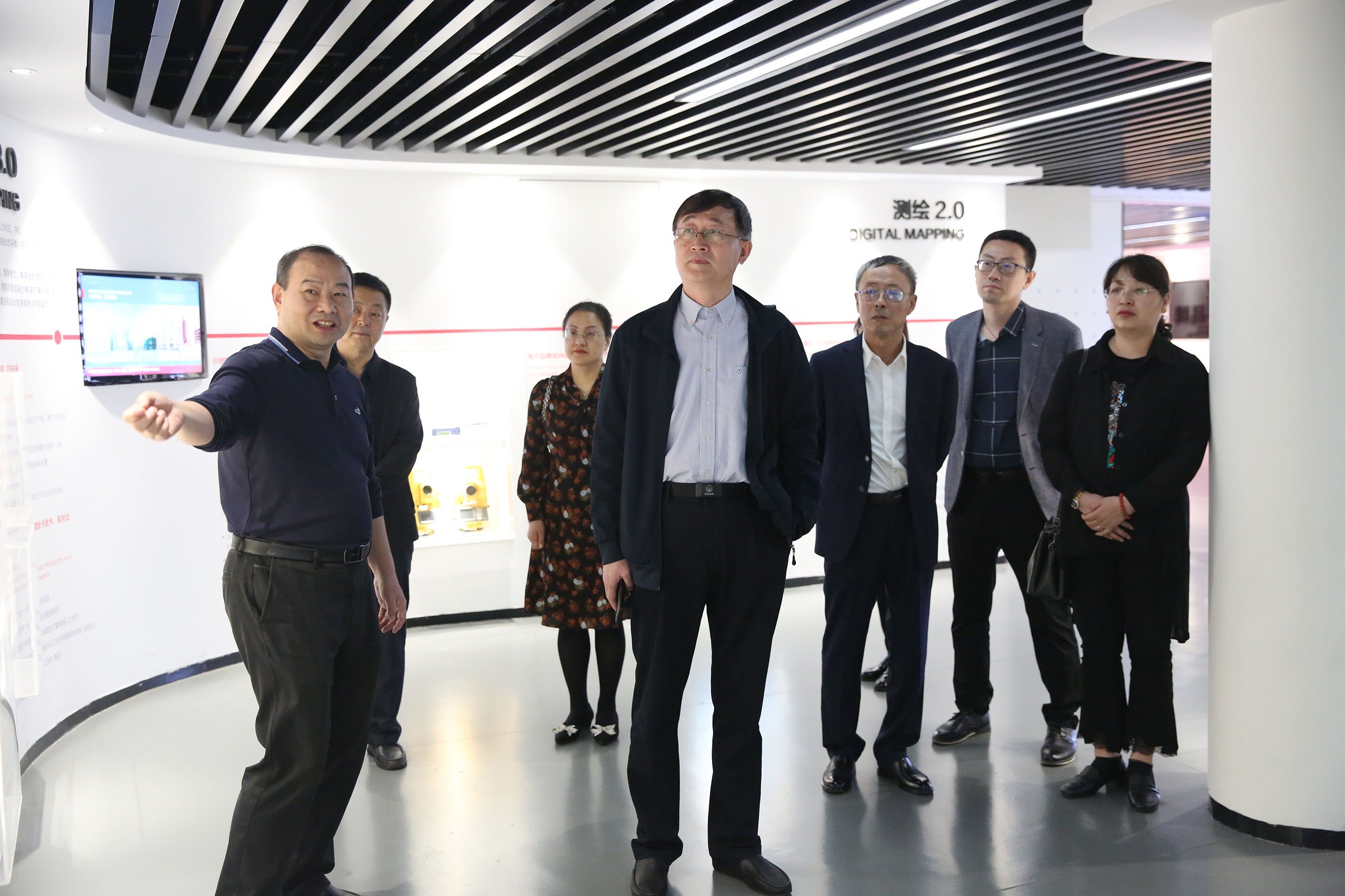 教育发展研究院总工张少铖带领考察组参观了集团展厅,向考察组详细介绍了南方测绘集团的发展历程、主营业务和企业文化等,现场演示了虚拟仿真教学产品。