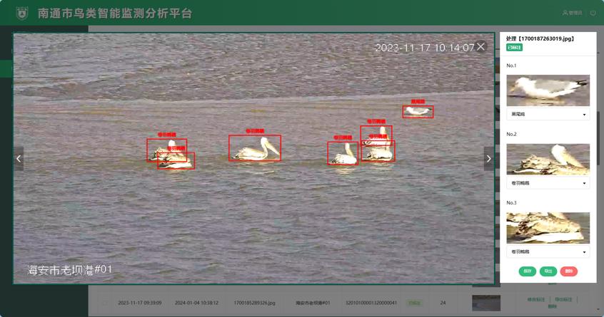 近日,7只国宝——卷羽鹈鹕在海安老坝港滨海湿地一现身,就被当地生态环境部门布设的AI鸟类智能监测设备捕捉并识别到了。