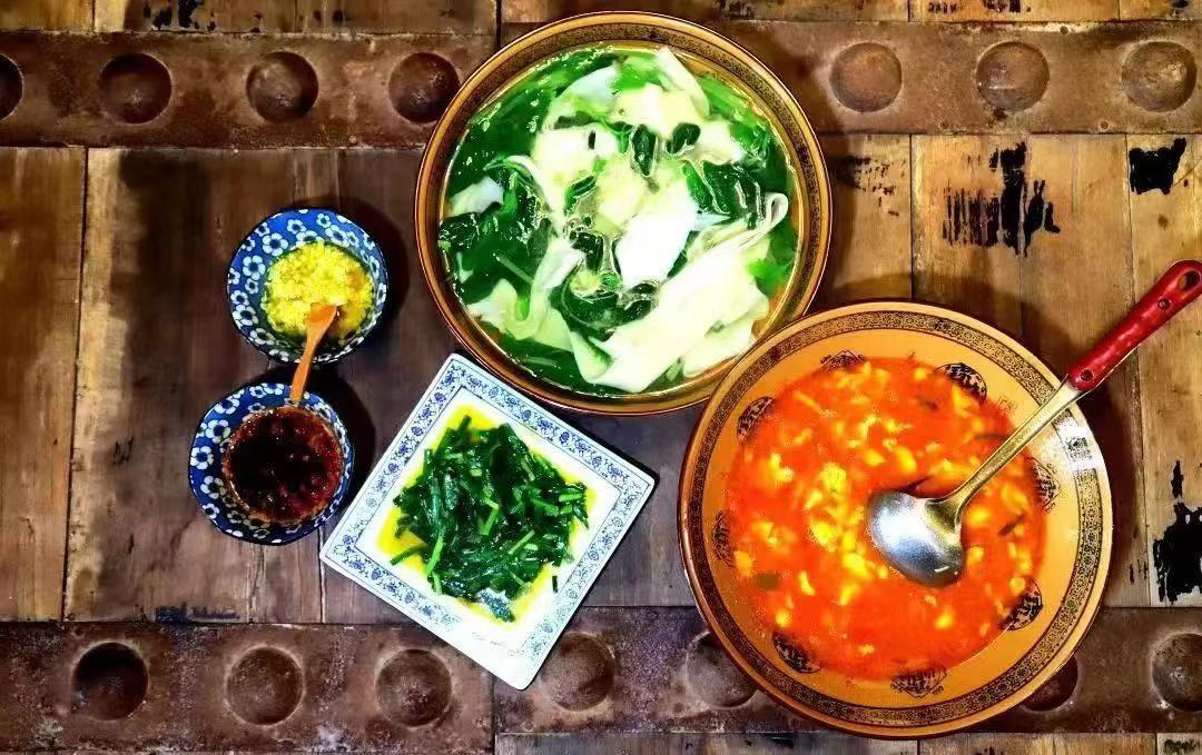 大锅里再添水,烧开后,将揉搓好的面剂子一根根拿出来,在梨木大案上又扯又甩,扯成一钱厚,三指宽,三拃长,形若裤带的面条。根根面条甩入开水锅中,硬柴火架上猛烧一气儿,待大锅里的面和汤煎三煎,滚三滚,面条由白变青,透透亮亮。像游龙戏水般飘在汤上面时,向锅里下入灰灰菜或仁汉菜(苋菜),再煮一煎,将面和菜一并捞出,倒入提前准备的一大盆凉水。热面入水的做法是有讲究的:一来热面倒入凉水中可以根根分开,爽爽利利,不至于粘在一起;二来热面被冷水一激会更加筋道,更有嚼头;三是经凉水过一下,面条更容易入口,吃起来节省时间。