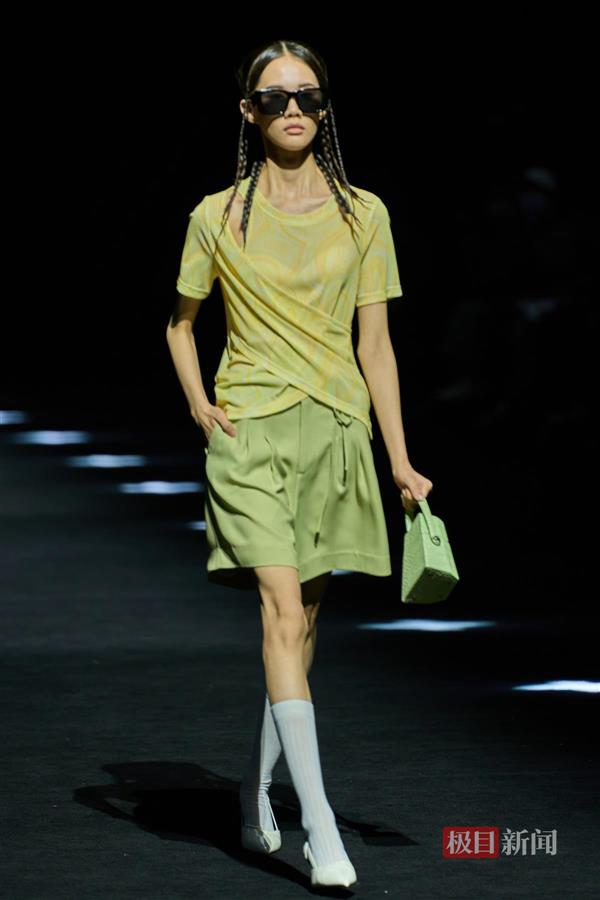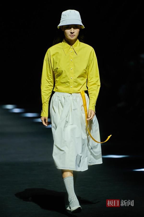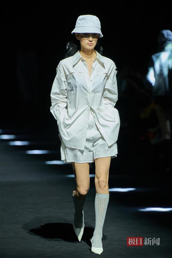 “将自然元素引入生活,在生活中找乐子。”设计师朱磊介绍,“印迹•2023”使用通透纱质面料与特殊质感面料交互搭配,以亮白色、淡紫色、青葱绿构成本季服装的色彩基调,演绎人与自然间的亲密关系及穿着者不被当下束缚,自由自在、心无旁骛的纯真状态。