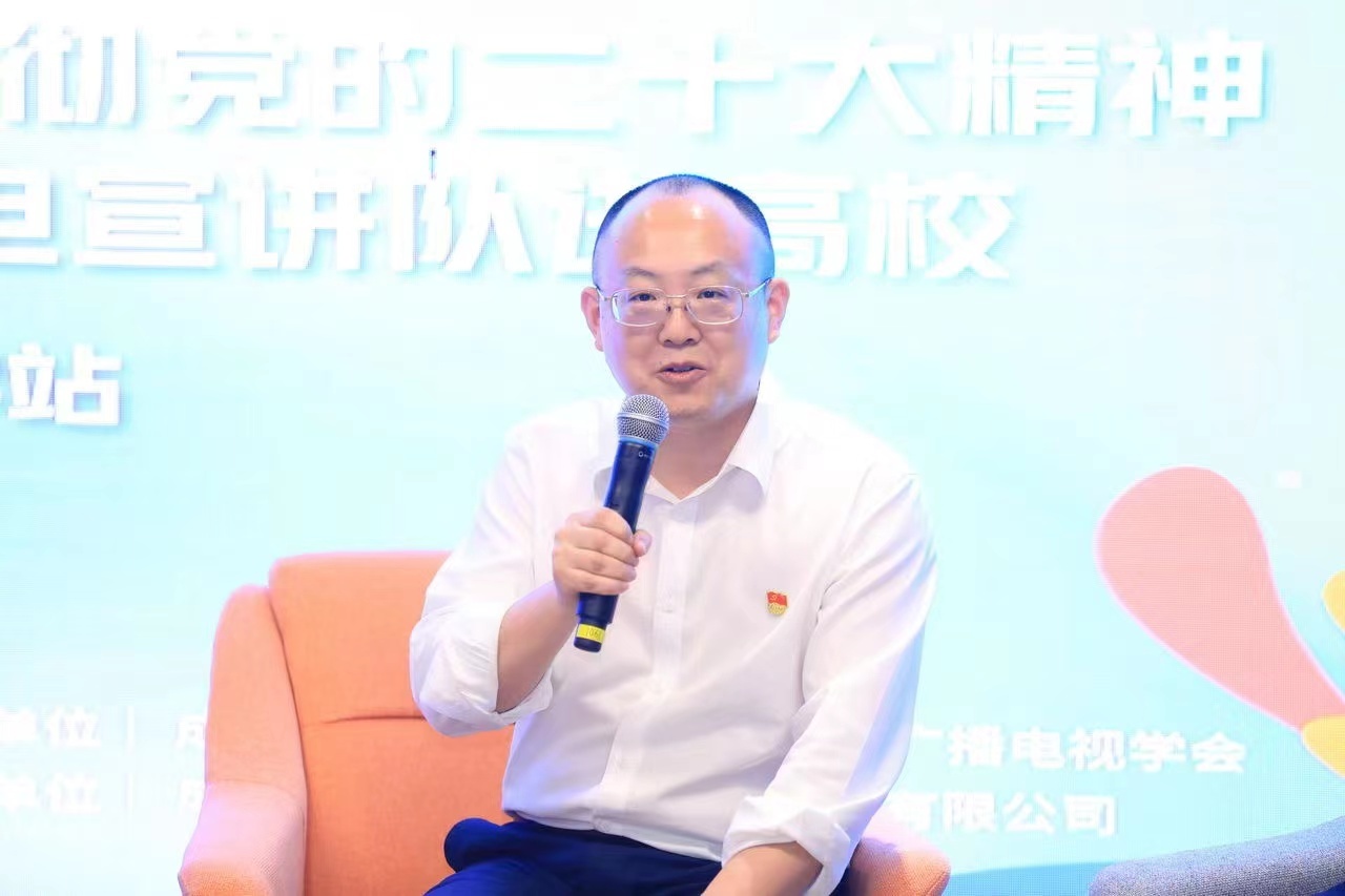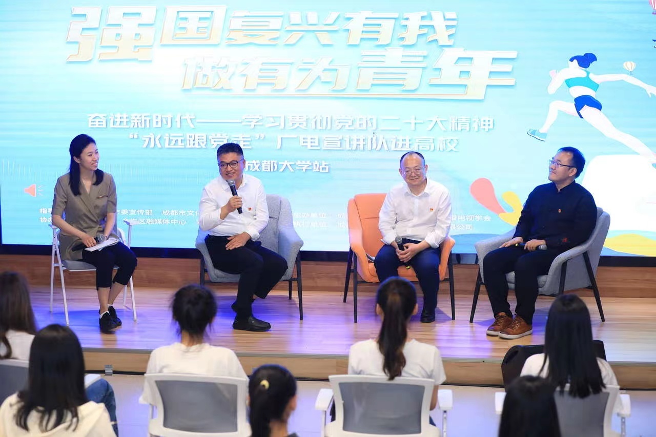 今天,奋进新时代——学习贯彻党的二十大精神“永远跟党走”广电宣讲队进高校活动在成都大学举行。围绕“强国复兴有我,做有为青年”的主题,四十多位大学生与西南民族大学马克思主义学院副院长、副教授高乃云、成都大学文新学院副教授、研究生导师李建峰、四川省委讲师团宣讲员、成都市广播电视台广播传媒中心主持人武世杰、成都市广播电视台全媒体新闻中心记者王倩倩面对面交流座谈,“青年、青春的本质内涵究竟是什么?”“青年人该有什么样的理想和信仰?如何将自身的发展和国家的命运相结合?”在这场主题沙龙中,同学们不断碰撞出青春的火花,怀抱梦想又脚踏实地,新时代有为的新青年们用理论之光照亮前进路。