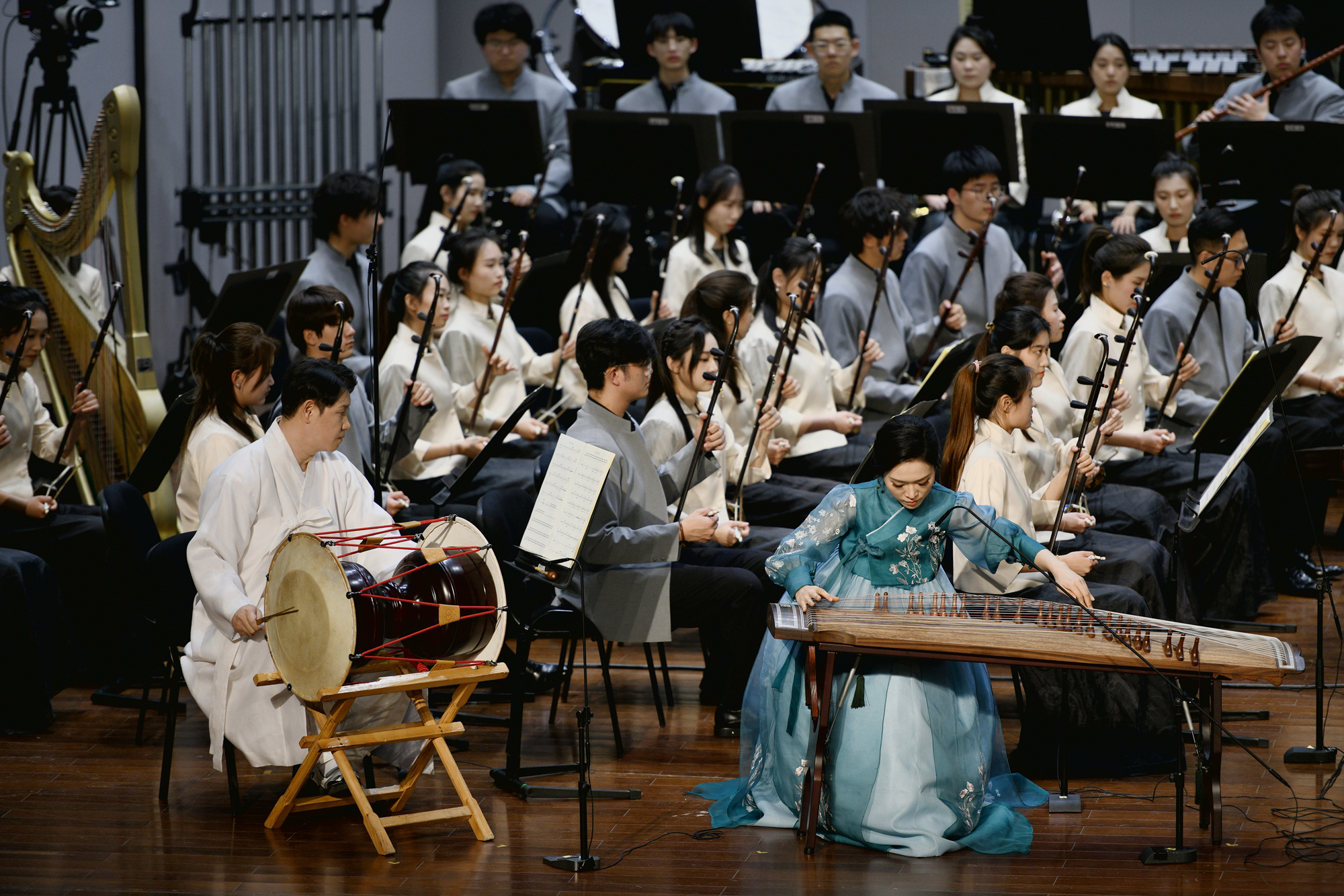 音乐会上半场演奏的是三首伽倻琴作品。伽倻琴作为朝鲜民族的最具代表性的弹拨弦鸣乐器之一。流行于朝鲜半岛和中国吉林省延边朝鲜族自治州。现在使用的伽倻琴音阶排列有七声和五声两种,乐器种类主要是按演奏的音乐类型来划分,可分为“正乐伽倻琴”、“散调伽倻琴”和专门为现代创作作品改良制作的“25弦伽倻琴”。在这次音乐会上用到的是“散调伽倻琴”和“25弦伽倻琴”。