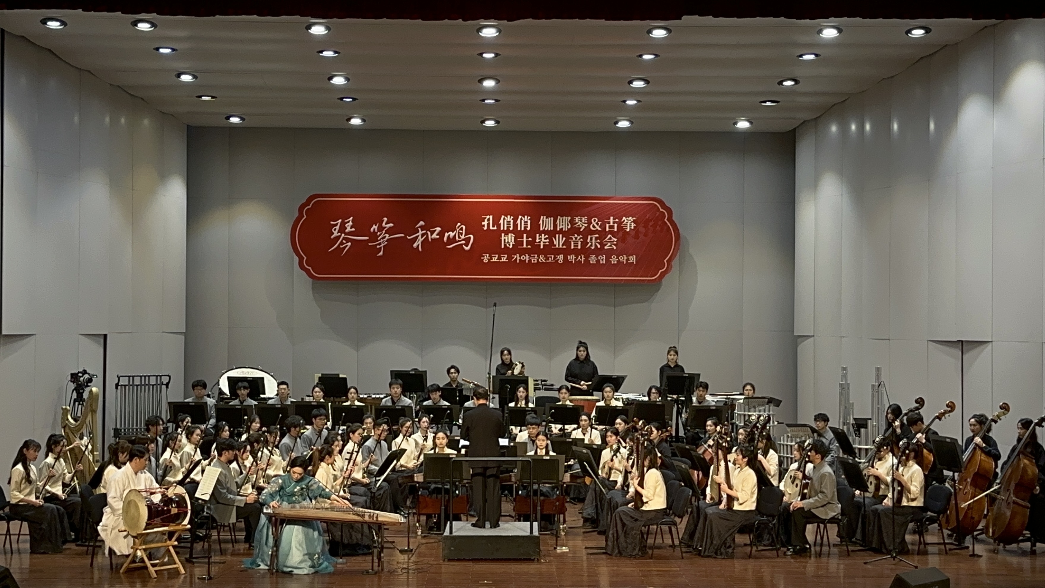 3月24日晚,青年古筝演奏家和伽倻琴演奏家、翡翠筝团首席、浙江外国语学院艺术学院青年古筝教师孔俏俏“琴筝和鸣”博士毕业音乐会在浙江音乐厅举行。作为浙江音乐家协会青年古筝演奏家系列音乐会之一,本次音乐会特邀浙江音乐学院国乐系主任王甫建执棒,并领携浙江音乐学院民族乐队学院加盟合作,由浙江音乐学院国乐系周展、盛秧两位教授担任艺术总监,以及特邀延边歌舞团长鼓演奏家徐亨虎共同演绎,上演了一场高质量、高水准的中韩筝乐艺术对话。