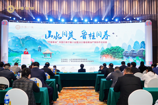 3月29日上午,“齐鲁粮油”中国行南宁推介会暨2023鲁桂粮油产销协作洽谈会在广西南宁举行。山东、广西两省区各级粮食行政管理部门和40多家粮食企业的代表济济一堂,共商产销协作,共谋产业发展。会上,山东省粮食和物资储备局党组书记、局长王伟华,广西壮族自治区粮食和物资储备局党组成员、副局长韦尚英作讲话。山东商务职业学院作为全省唯一一所粮食行业办学的高职院校,受邀参加大会。