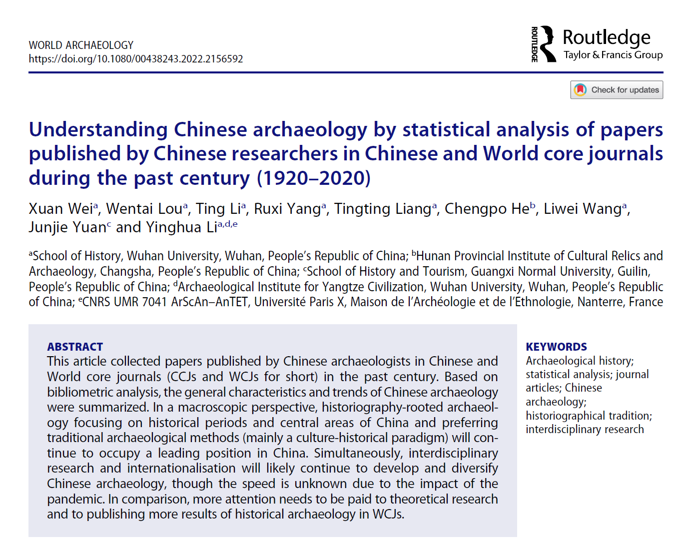 近日,国际学术期刊《世界考古》(World Archaeology, A&HCI收录)在线发表了武汉大学历史学院、武汉大学长江文明考古研究院的最新科研成果《从中国学者1920-2020发表的中外文核心期刊论文看中国考古学的发展历程》(Understanding Chinese archaeology by statistical analysis of papers published by Chinese researchers in Chinese and World core journals during the past century (1920–2020))。武汉大学历史学院博士研究生韦璇为第一作者,李英华教授为通讯作者,硕士研究生娄文台、李婷、杨濡僖、梁婷婷、王丽维为共同作者。