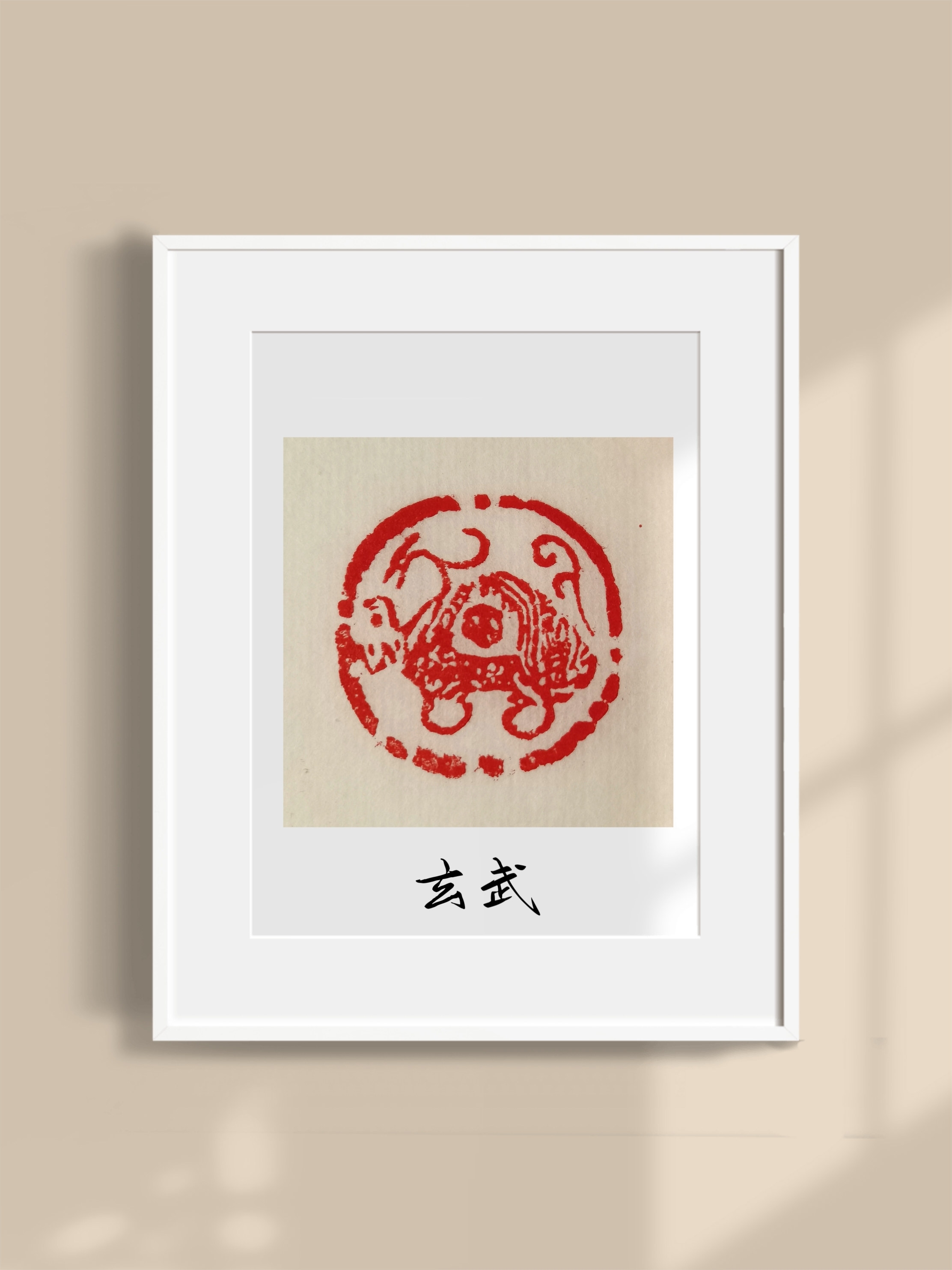 玄武瓦当是“四象”纹饰瓦当中的一种。“四象”,又称四大神兽,分别是青龙、白虎、朱雀和玄武。早在殷商时期,先民就把天分为东西南北四宫,分别以青龙、白虎、朱雀、玄武作为象征。随后其意象经过宗教的再解释得到不断发展。“四象”瓦当在秦汉时期不常见于坊间建筑,主要见于宫殿建筑或祖庙的屋檐前方。“四象”是汉代的人们臆想出来并崇拜的四种动物,被视为祥瑞的化身。
