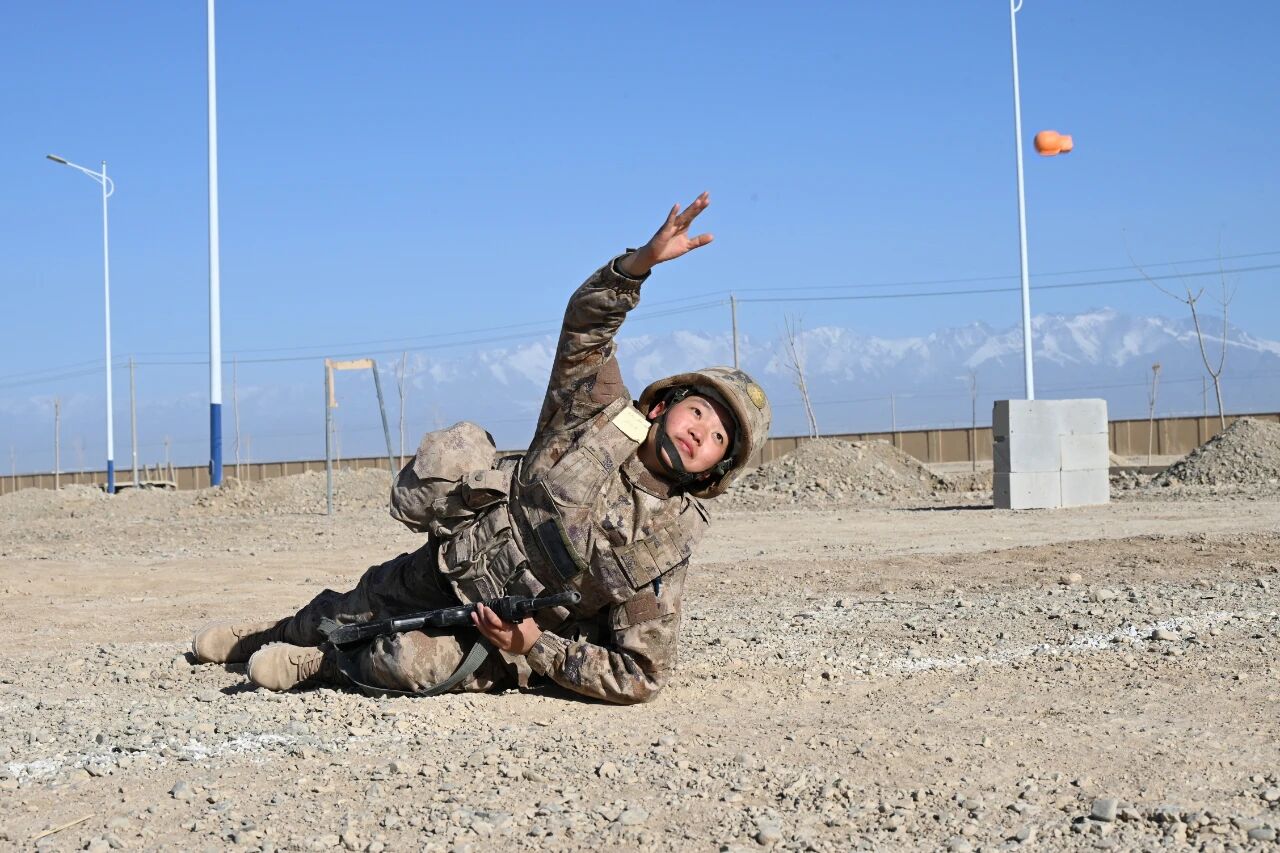 ▲卧姿手榴弹投掷训练