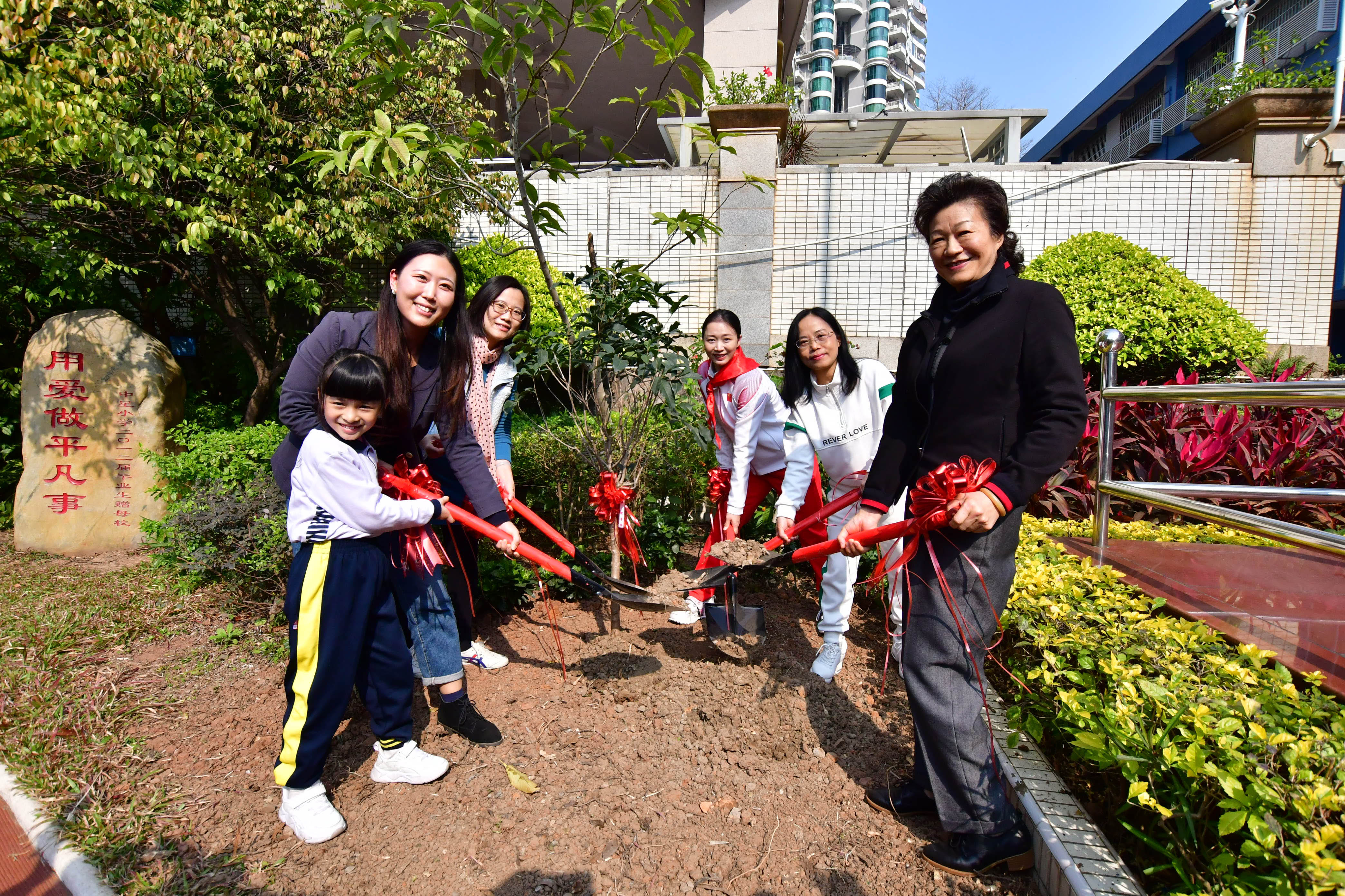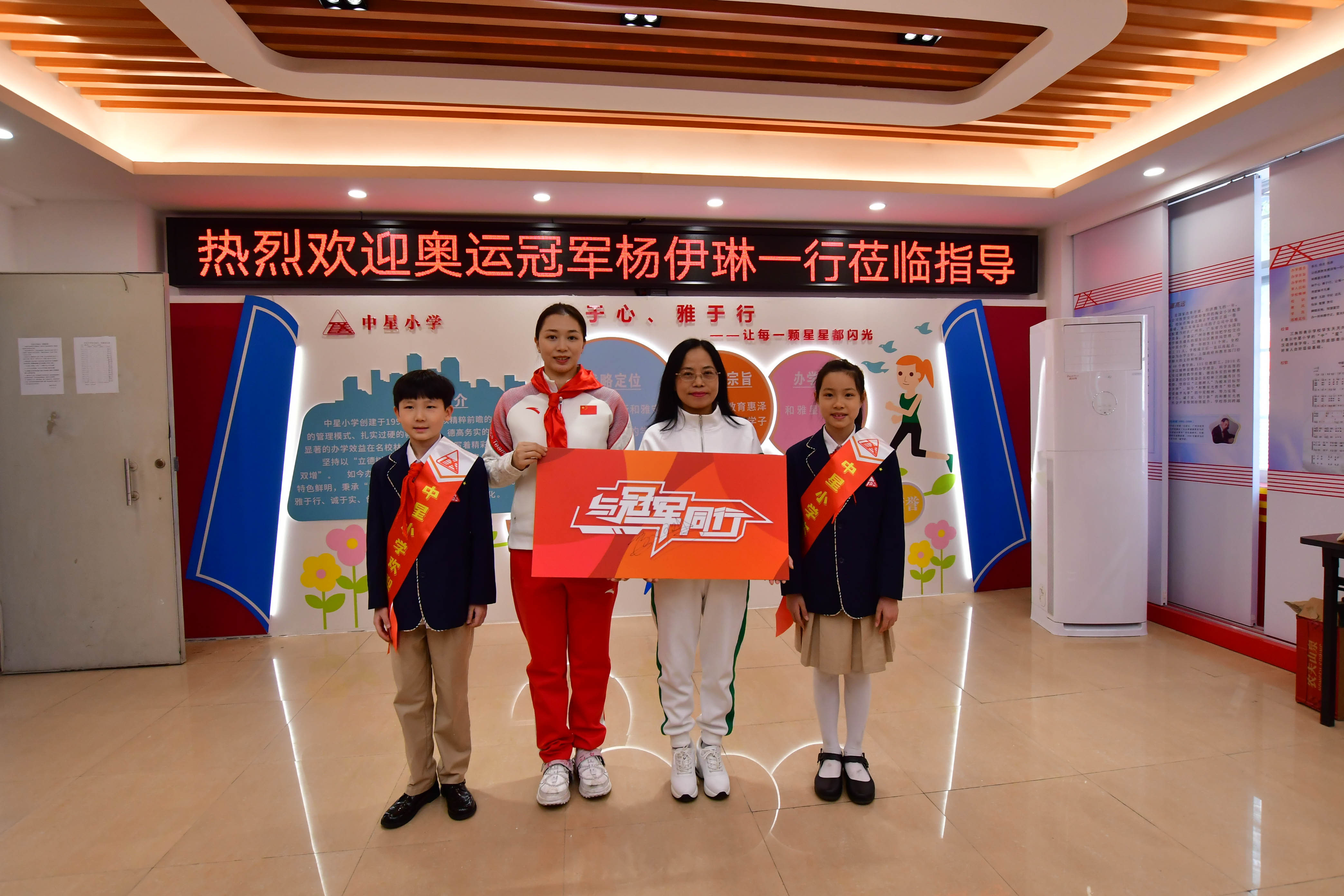 杨伊琳现场按下金手印,为学校留下了“冠军”的印记,还为学校颁发了“与冠军同行——公益合作单位”的牌匾,蕴含着体育精神的传承,她还为学校种下了一颗桂花树,寓意与同学们共同成长。中星小学校长林伟贞对“与冠军同行”来到学校感到非常荣幸,通过与冠军的近距离接触向他们学习,可以让同学们得到奥运精神的熏陶,焕发积极向上的动力,跟体育一样,身体、学习都需要更高更快更强更团结。