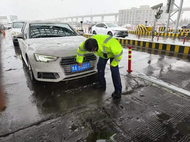 为提高车牌识别率和通行率,防止因积雪遮挡车牌而影响到车辆行驶路径识别,产生出口争议流水,中原高速航空港分公司郑州南收费站工作人员帮有积雪的车辆清除车牌积雪。
