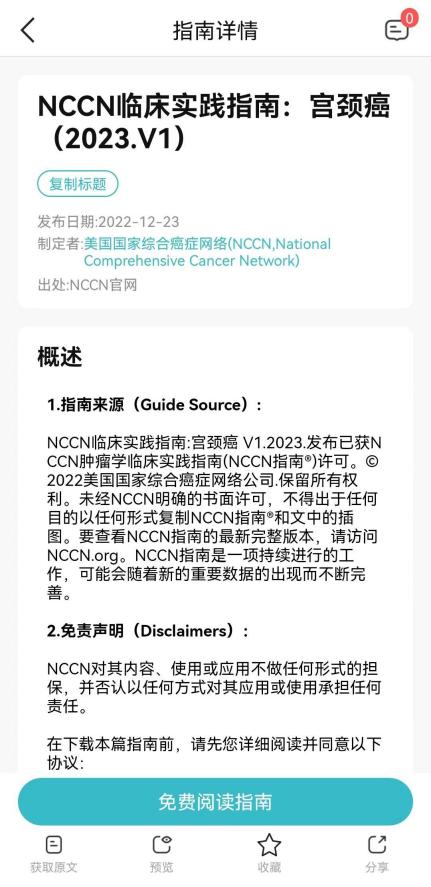 您可以在医脉通平台,包括:网站/移动端(医脉通APP、临床指南APP),免费获取准确且已授权的正版NCCN内容。并会持续上线NCCN指南中文翻译版,以便大家学习使用。