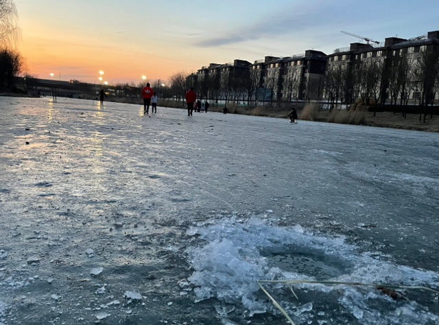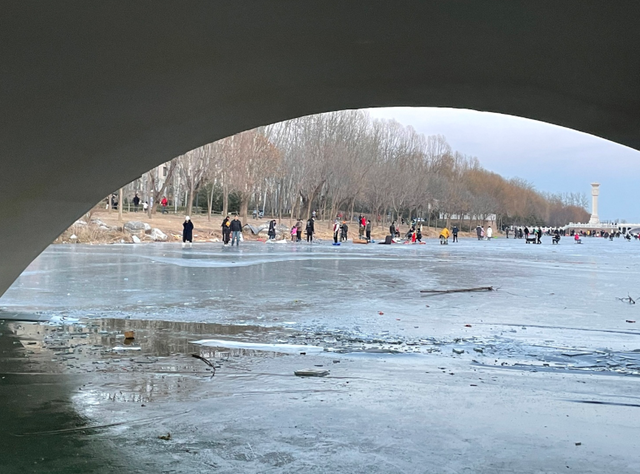 近日,在北京朝阳马家湾湿地公园一桥下,2位市民不慎掉入冰窟窿,幸亏有热心市民将其拉上岸。可以发现,附近仍有不少居民在冒险滑冰。视频来源:@BRTVi生活