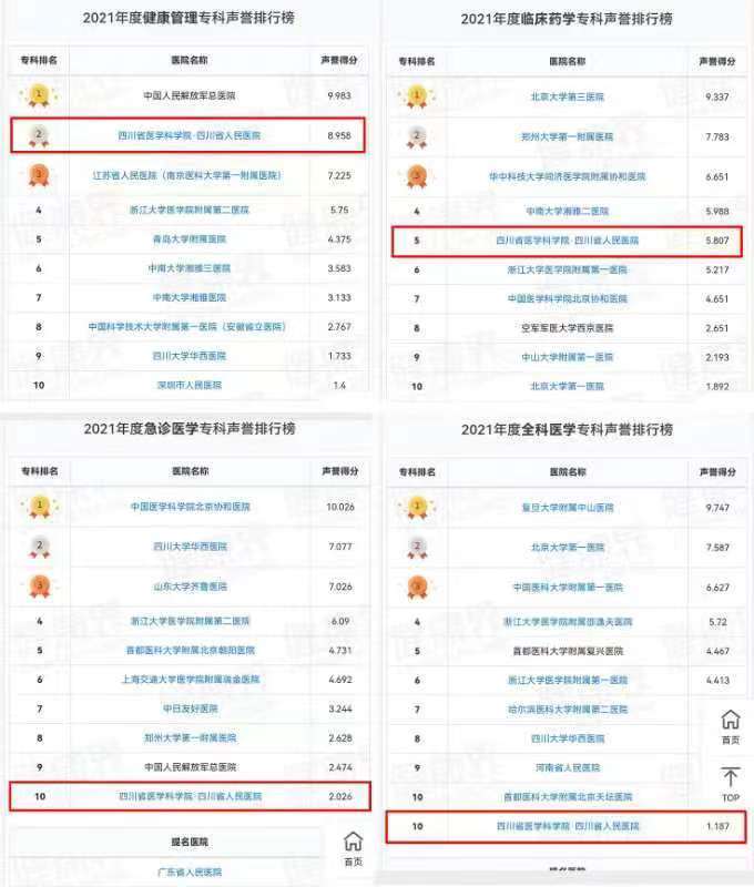 在本次榜单中,四川省人民医院9个学科荣登中国医院专科声誉榜单。其中健康管理排名全国第2位,临床药学排名全国第5位,急诊医学、全科医学排名全国第10位,检验医学排名全国第11位,小儿外科排名全国第20位、眼科排名全国第21位、肾脏病学排名全国第22位、超声医学排名全国第23位。