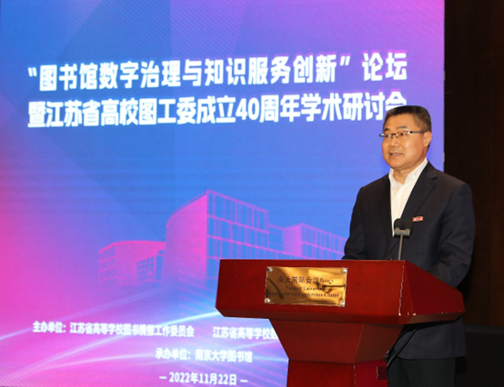 南京大学图书馆馆长黄贤金作大会主题报告《迈进高校图书馆事业高质量发展新征程——江苏省高校图工委成立40周年回顾与展望》。他表示,未来图工委将聚焦高校图书馆的现代化建设,创新知识服务高教发展新思路,强化知识服务立德育人新要求,开启知识服务教育强国新征程,为江苏省高等教育高质量发展贡献全体图书馆人的智慧和力量。