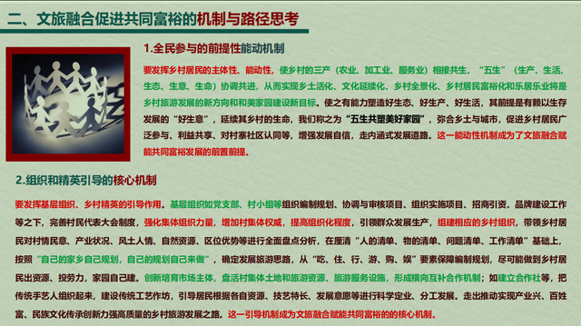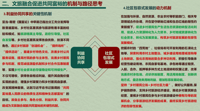 发展的“好生意”,延续其乡村的生命,我们称之为,弥合乡土与城市,促进乡村居民广泛参与、利益共享、对村寨社区认同等,增强发展自信,走内涵式发展道路。这一能动性机制成为了文旅融合赋能共同富裕发展的前置前提。