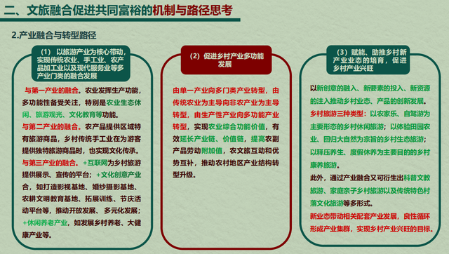 由单一产业向多门类产业转型,由传统农业为主导向非农产业为主导转型,由生产性产业向多功能产业转型,实现农业综合功能价值,有效延长产业链、价值链,提高农副产品劳动附加值,农文旅互动和优势互补,推动农村地区产业结构转型升级。