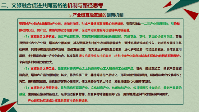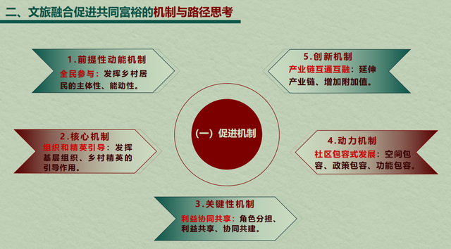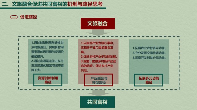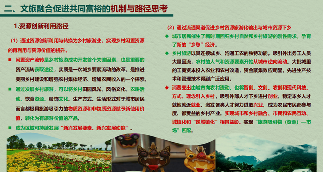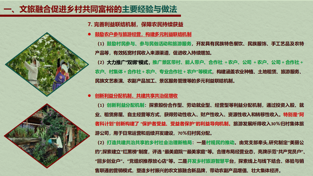 创新培育市场主体,盘活村集体土地和旅游资源、旅游服务设施,形成横向互补合作机制;如建立合作社等,把传统手艺人组织起来,建设传统工艺作坊,引导居民根据各自资源、技艺特长、发展意愿等进行科学定业、分工发展。走出推动实现产业兴、百姓富、民族文化传承创新力强高质量的乡村旅游发展之路。这一引导机制成为文旅融合赋能共同富裕的的核心机制。