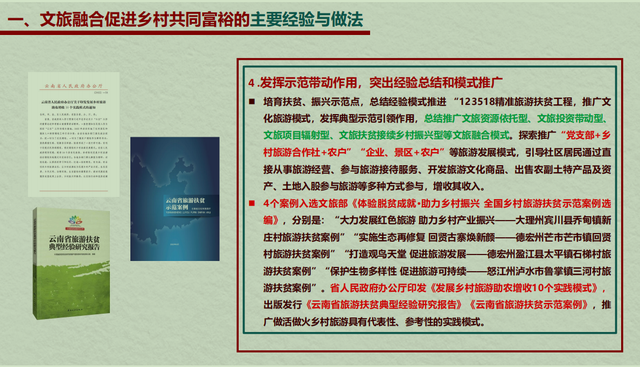 4个案例入选文旅部《体验脱贫成就·助力乡村振兴 全国乡村旅游扶贫示范案例选编》,分别是:“大力发展红色旅游 助力乡村产业振兴——大理州宾川县乔甸镇新庄村旅游扶贫案例”“实施生态再修复 回贤古寨焕新颜——德宏州芒市芒市镇回贤村旅游扶贫案例”“打造观鸟天堂 促进旅游发展——德宏州盈江县太平镇石梯村旅游扶贫案例”“保护生物多样性 促进旅游可持续——怒江州泸水市鲁掌镇三河村旅游扶贫案例”。