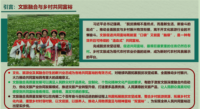 与第三产业的融合。为乡村旅游提供展示、宣传的平台;合,如打造影视基地、婚纱摄影基地、农耕文明教育基地、拓展训练、节庆活动平台等,推动开放发展、 多元化发展;,如发展乡村养老、大健康产业等。
