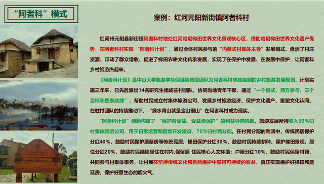 《阿者科计划》是中山大学旅游学院保继刚教授团队为阿者科村单独编制的乡村旅游发展规划。计划实施三年来,已先后派出14名研究生组成驻村团队,协同当地青年干部,通过“一个模式、两方参与、三个目标和四条底线”,帮助村民成立村集体旅游公司、发展乡村旅游经济、保护文化遗产、重塑文化认同。