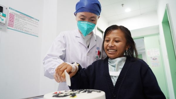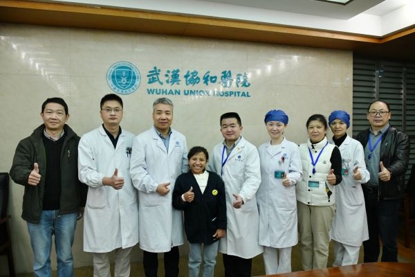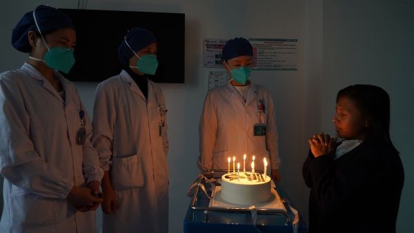 11月17日,协和医疗团队为娜袜庆祝“重生”。她的脸上绽放阳光,眼睛充满笑容,即将出院的她说:我要回去为乡亲们当一辈子“最美医生”。