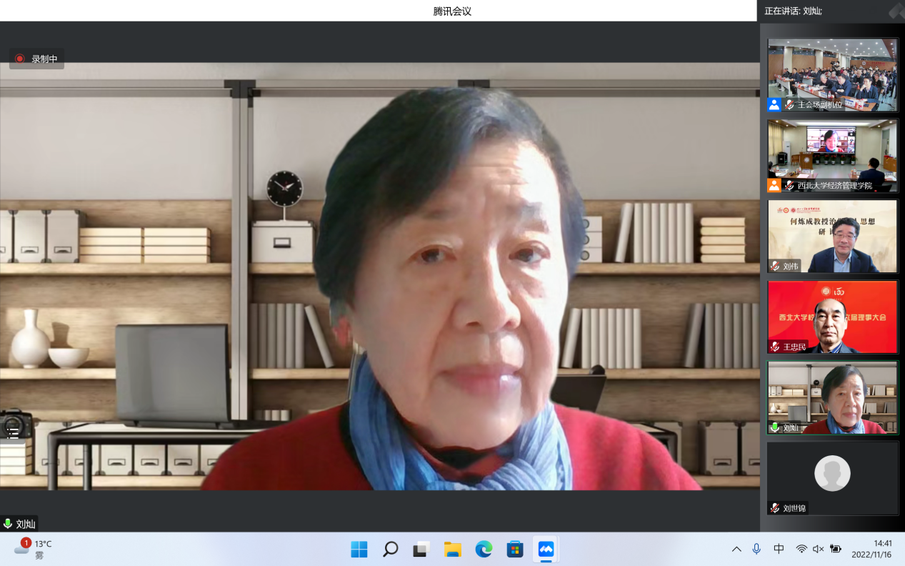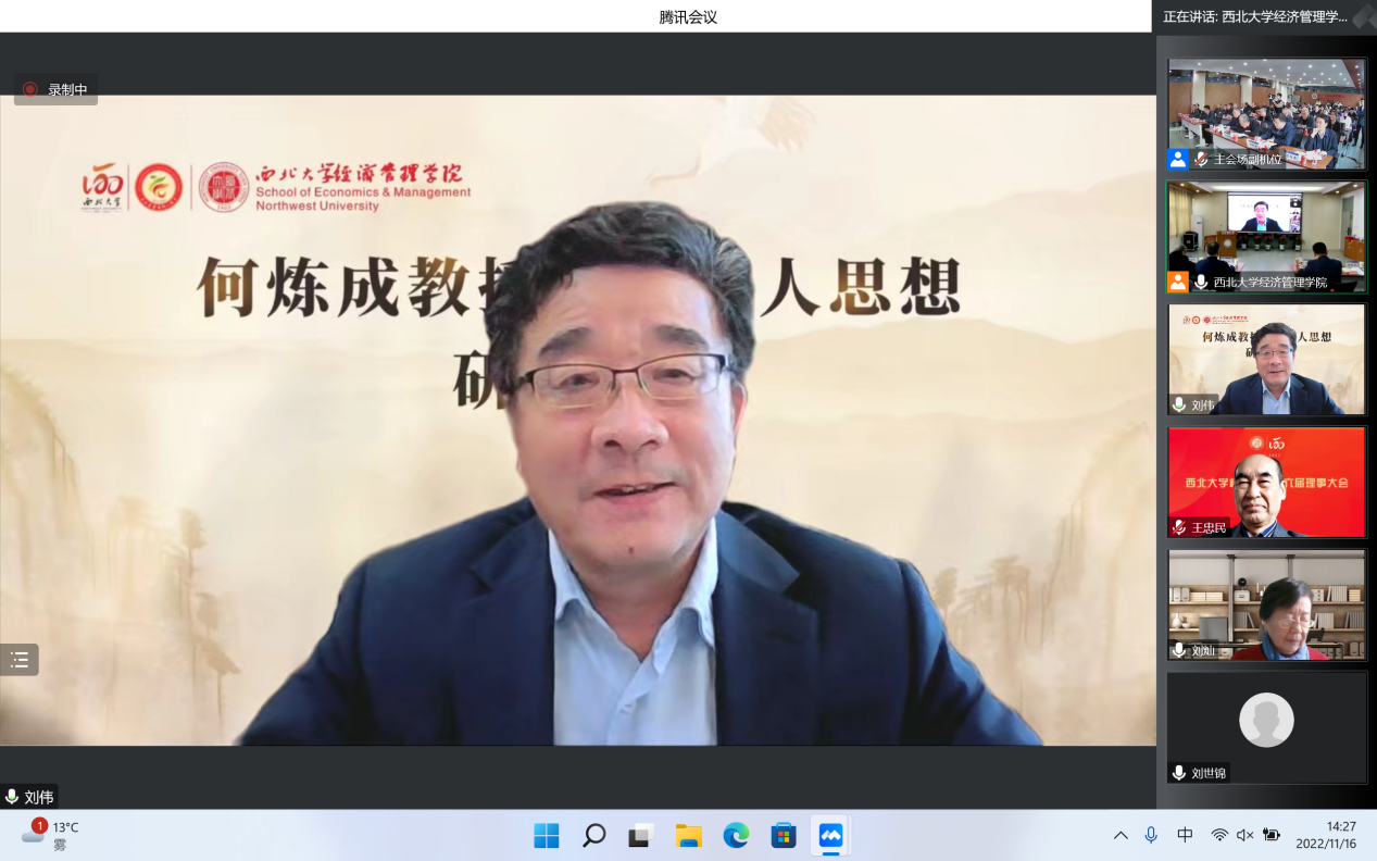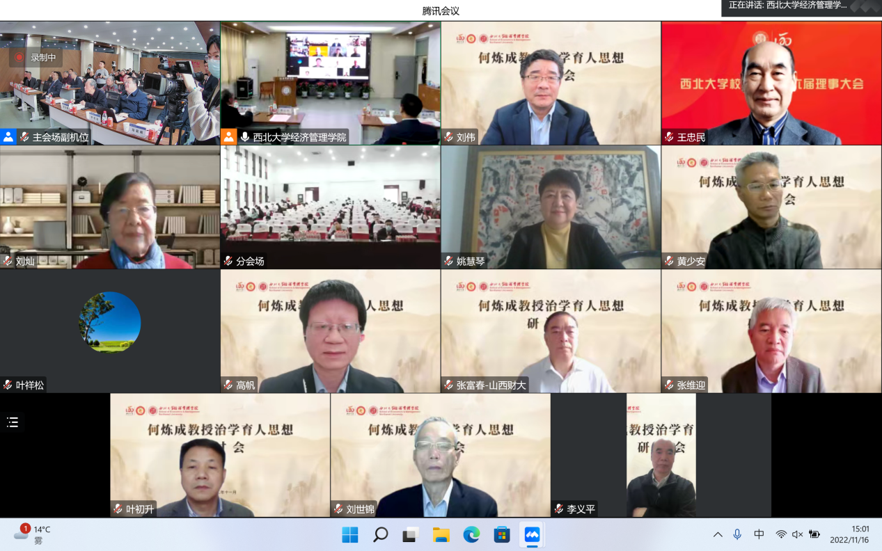 11月16日,由西北大学经济管理学院主办的“何炼成教授治学育人思想研讨会”成功举办。日本京都学园大学、北京大学、中国人民大学、复旦大学、武汉大学、山东大学、西安交通大学、西北工业大学、西南财经大学、陕西师范大学、西北大学等17所高校和国务院发展研究中心、全国社会保险基金、陕西金融资产管理股份有限公司、浙江大慧置业等多家单位的学者参加。本次研讨会采用“线上线下”结合的方式,同步设立主会场与分会场,共计200余名师生参加会议。