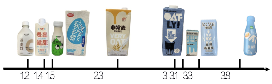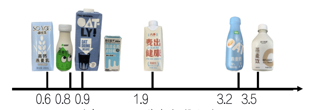 近一半的燕麦奶脂肪含量都在3g以上,与牛奶差不多。最低和最高两者相差3倍多,如: