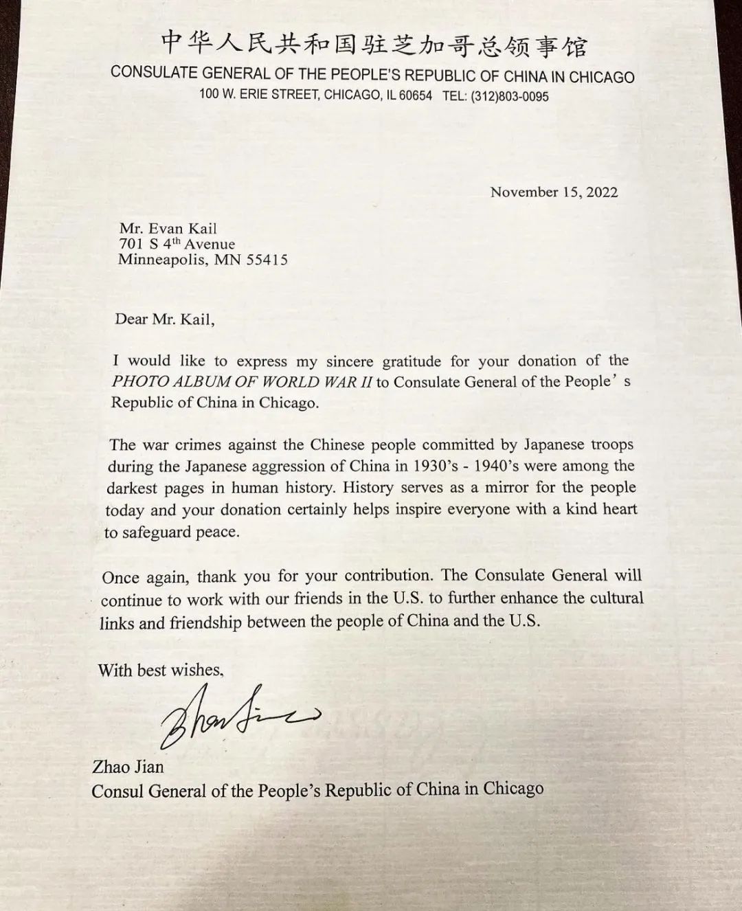在帖子中,埃文还公开了中国驻芝加哥总领事馆的一封感谢信,领事馆在信中向埃文表达了诚挚的感谢。信中还表示,日军20世纪30年代至40年代在中国所犯下的战争罪行,是人类历史上至暗的一页。历史是一面镜子,埃文的捐赠将激励世人以善良之心守卫和平,领事馆也会继续为中美人民之间的文化联系和友谊而努力。